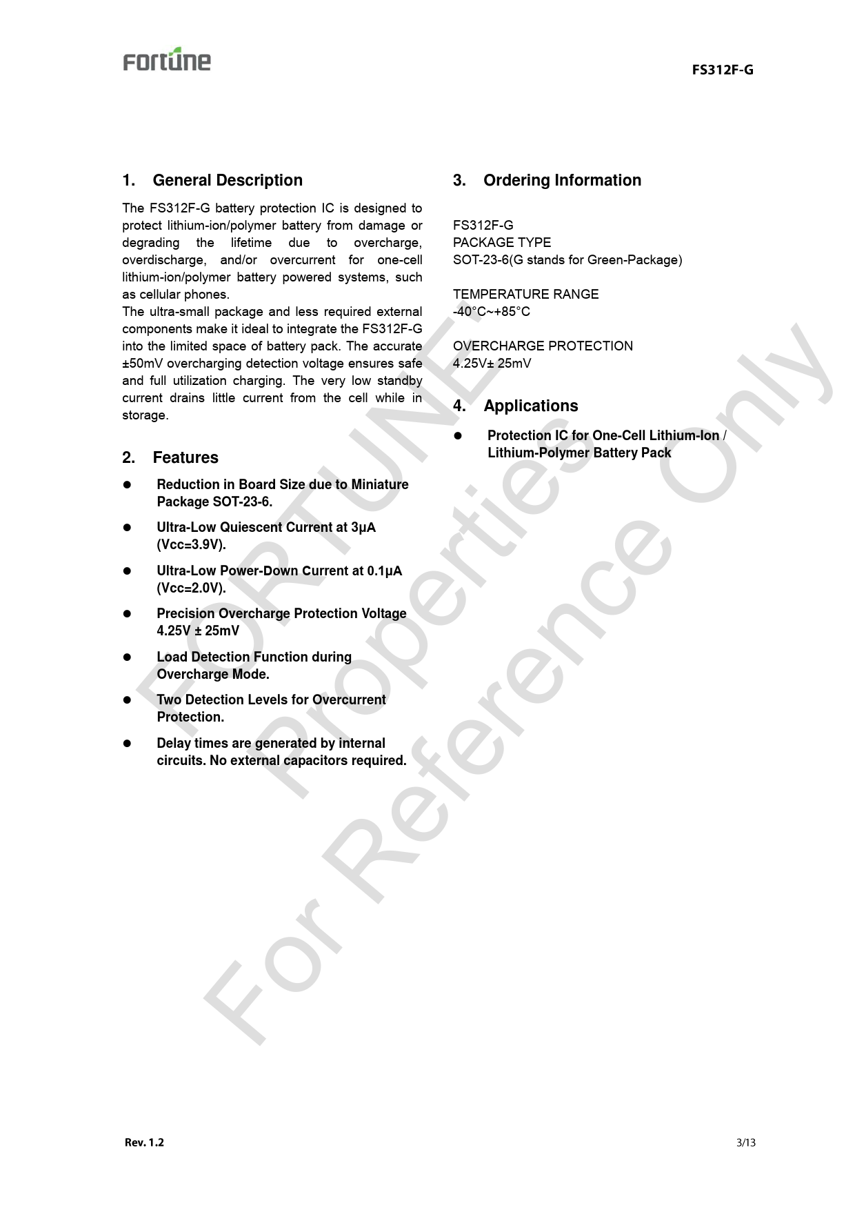 1. General Description Ordering Information FS312F-G PACKAGE TYPE SOT-23-6(G stands for Green-Package) TEMPERATURE RANGE -40°C~+85°C OVERCHARGE PROTECTION 4.25V± 25mV FO Fo P R r R ro TU ef pe NE er rti ' en es ce O nl y The FS312F-G battery protection IC is designed to protect lithium-ion/polymer battery from damage or degrading the lifetime due to overcharge, overdischarge, and/or overcurrent for one-cell lithium-ion/polymer battery powered systems, such as cellular phones. The ultra-small package and less required external components make it ideal to integrate the FS312F-G into the limited space of battery pack. The accurate ±50mV overcharging detection voltage ensures safe and full utilization charging. The very low standby current drains little current from the cell while in storage. 3. 4. 2. Features Reduction in Board Size due to Miniature Package SOT-23-6. Ultra-Low Quiescent Current at 3μA (Vcc=3.9V). Ultra-Low Power-Down Current at 0.1μA (Vcc=2.0V). Precision Overcharge Protection Voltage 4.25V ± 25mV Load Detection Function during Overcharge Mode. Two Detection Levels for Overcurrent Protection. Delay times are generated by internal circuits. No external capacitors required. Applications Protection IC for One-Cell Lithium-Ion / Lithium-Polymer Battery Pack