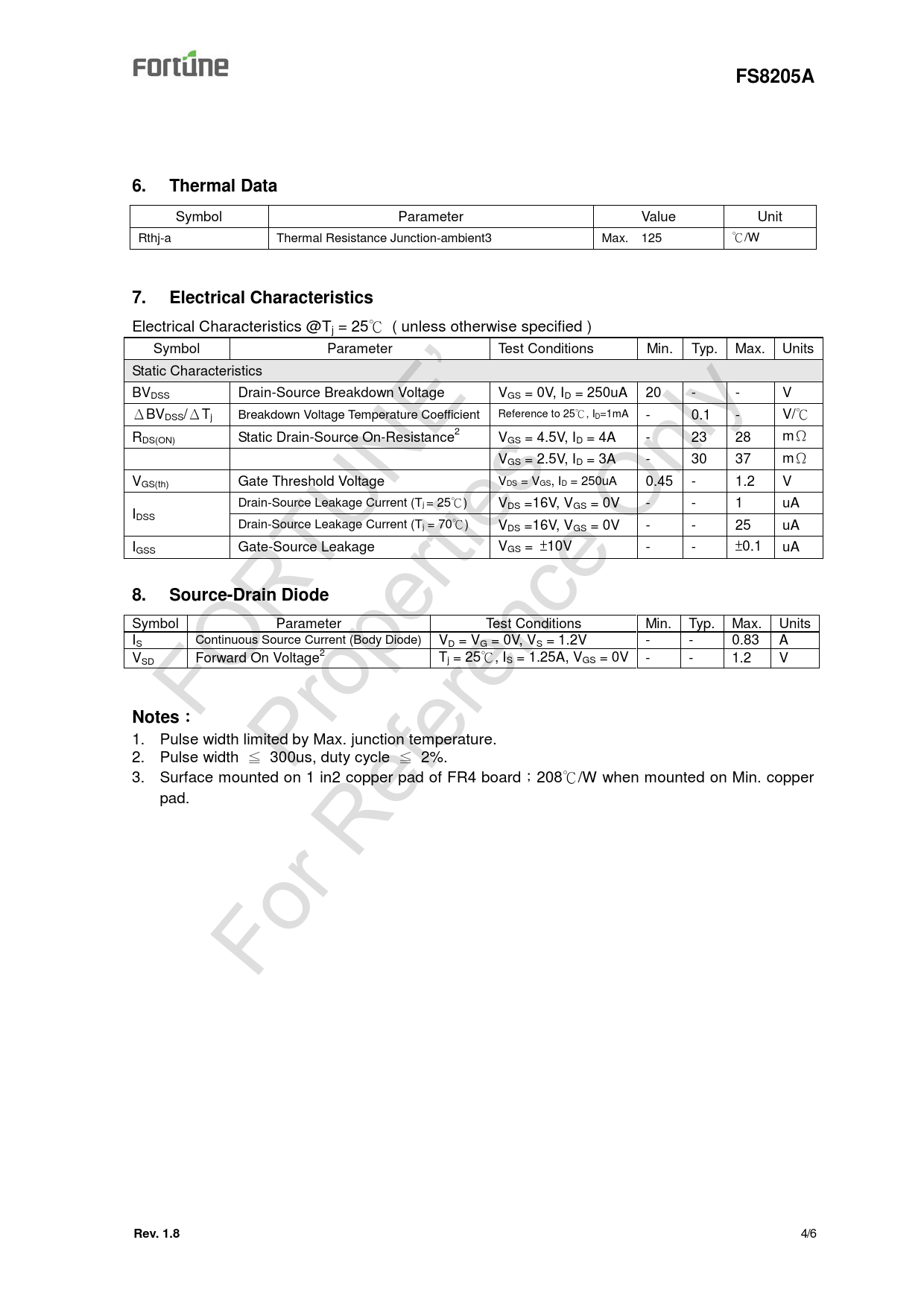 FS8205A 6. Thermal Data Symbol Parameter Rthj-a 7. Value Thermal Resistance Junction-ambient3 Max. Unit ℃/W 125 Electrical Characteristics Electrical Characteristics @Tj = 25℃ ( unless otherwise specified ) Symbol Parameter Test Conditions Min. Typ. Max. Units FO Fo P R r R ro TU ef pe NE er rti ’ e en s ce O nl y Static Characteristics BVDSS Drain-Source Breakdown Voltage VGS = 0V, ID = 250uA 20 -V ΔBVDSS/ΔTj Breakdown Voltage Temperature Coefficient Reference to 25℃, ID=1mA -0.1 -V/℃ VGS = 4.5V, ID = 4A -23 28 mΩ VGS = 2.5V, ID = 3A -30 37 mΩ Gate Threshold Voltage VDS = VGS, ID = 250uA 0.45 -1.2 V Drain-Source Leakage Current (Tj = 25℃) VDS =16V, VGS = 0V -1 uA Drain-Source Leakage Current (Tj = 70℃) VDS =16V, VGS = 0V -25 uA Gate-Source Leakage VGS = ±10V -±0.1 uA Min. -Typ. -Max. 0.83 1.2 Units A V 2 RDS(ON) Static Drain-Source On-Resistance VGS(th) IDSS IGSS 8. Source-Drain Diode Symbol IS VSD Parameter Continuous Source Current (Body Diode) Forward On Voltage 2 Test Conditions VD = VG = 0V, VS = 1.2V Tj = 25℃, IS = 1.25A, VGS = 0V Notes: 1. Pulse width limited by Max. junction temperature. 2. Pulse width ≦ 300us, duty cycle ≦ 2%. 3. Surface mounted on 1 in2 copper pad of FR4 board;208℃/W when mounted on Min. copper pad. Rev. 1.8 4/6