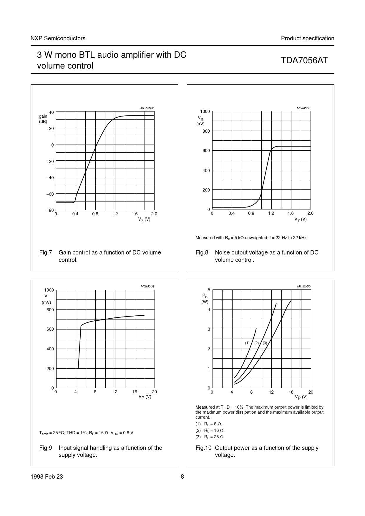 NXP Semiconductors Product specification 3 W mono BTL audio amplifier with DC TDA7056AT volume control MGM582 MGM583 40 1000 handbook, halfpage handbook, halfpage gain Vn (dB) (μV) 20 800 0 600 −20 400 −40 200 −60 −80 0 0 0.4 0.8 1.2 1.6 2.0 0 0.4 0.8 1.2 1.6 2.0 V7 (V) V7 (V) Measured with Rs = 5 kΩ unweighted; f = 22 Hz to 22 kHz. Fig.7 Gain control as a function of DC volume Fig.8 Noise output voltage as a function of DC control. volume control. MGM584 MGM585 1000 5 handbook, halfpage handbook, halfpage V P i o (mV) (W) 800 4 600 3 (1) (2) (3) 400 2 200 1 0 0 0 4 8 12 16 20 0 4 8 12 16 20 VP (V) VP (V) Measured at THD = 10%. The maximum output power is limited by the maximum power dissipation and the maximum available output current. (1) RL = 8 Ω. (2) R T L = 16 Ω. amb = 25 °C; THD = 1%; RL = 16 Ω; VDC = 0.8 V. (3) RL = 25 Ω. Fig.9 Input signal handling as a function of the Fig.10 Output power as a function of the supply supply voltage. voltage. 1998 Feb 23 8 Document Outline Features General description Quick reference data Ordering information Block diagram Pinning Functional description Power dissipation Limiting values Thermal characteristics Characteristics Test and application information Test conditions Voltage gain Output power Switch-on/switch-off Thermal behaviour: Short-circuit protection: Package outline Soldering Introduction Reflow soldering Wave soldering Repairing soldered joints Data sheet status Disclaimers