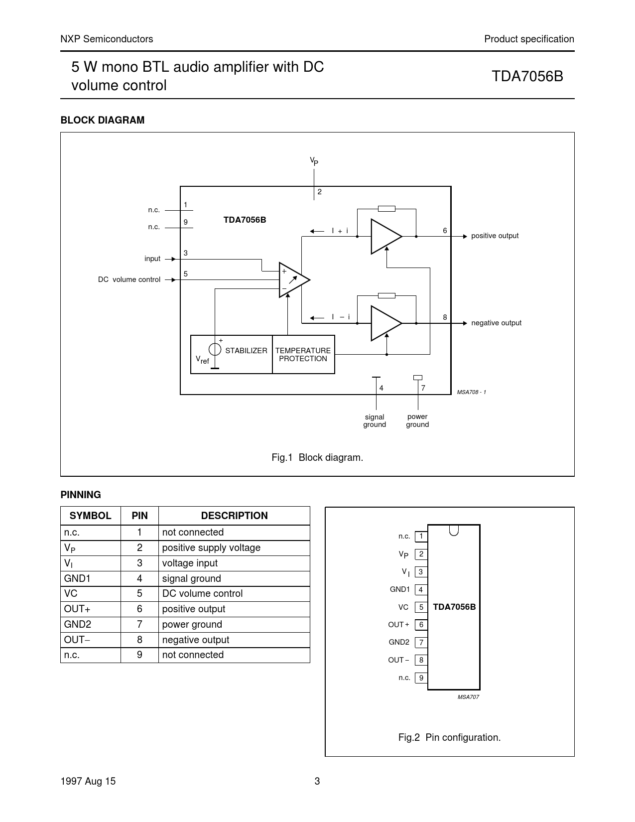 NXP Semiconductors Product specification 5 W mono BTL audio amplifier with DC TDA7056B volume control BLOCK DIAGRAM VP handbook, full pagewidth 2 1 n.c. TDA7056B 9 n.c. I + i 6 positive output 3 input 5 DC volume control I – i 8 negative output STABILIZER TEMPERATURE V PROTECTION ref 4 7 MSA708 - 1 signal power ground ground Fig.1 Block diagram. PINNINGSYMBOLPINDESCRIPTION n.c. 1 not connected handbook, halfpage n.c. 1 VP 2 positive supply voltage V 2 P VI 3 voltage input V 3 GND1 4 signal ground I GND1 VC 5 DC volume control 4 OUT+ 6 positive output VC 5 TDA7056B GND2 7 power ground OUT 6 OUT 8 negative output GND2 7 n.c. 9 not connected OUT 8 n.c. 9 MSA707 Fig.2 Pin configuration. 1997 Aug 15 3 Document Outline Features General description Quick reference data Ordering information Block diagram Pinning Functional description Power dissipation Limiting values Thermal characteristics Characteristics Test and application information Package outline Soldering Introduction Soldering by dipping or by wave Repairing soldered joints Data sheet status Definitions Disclaimers