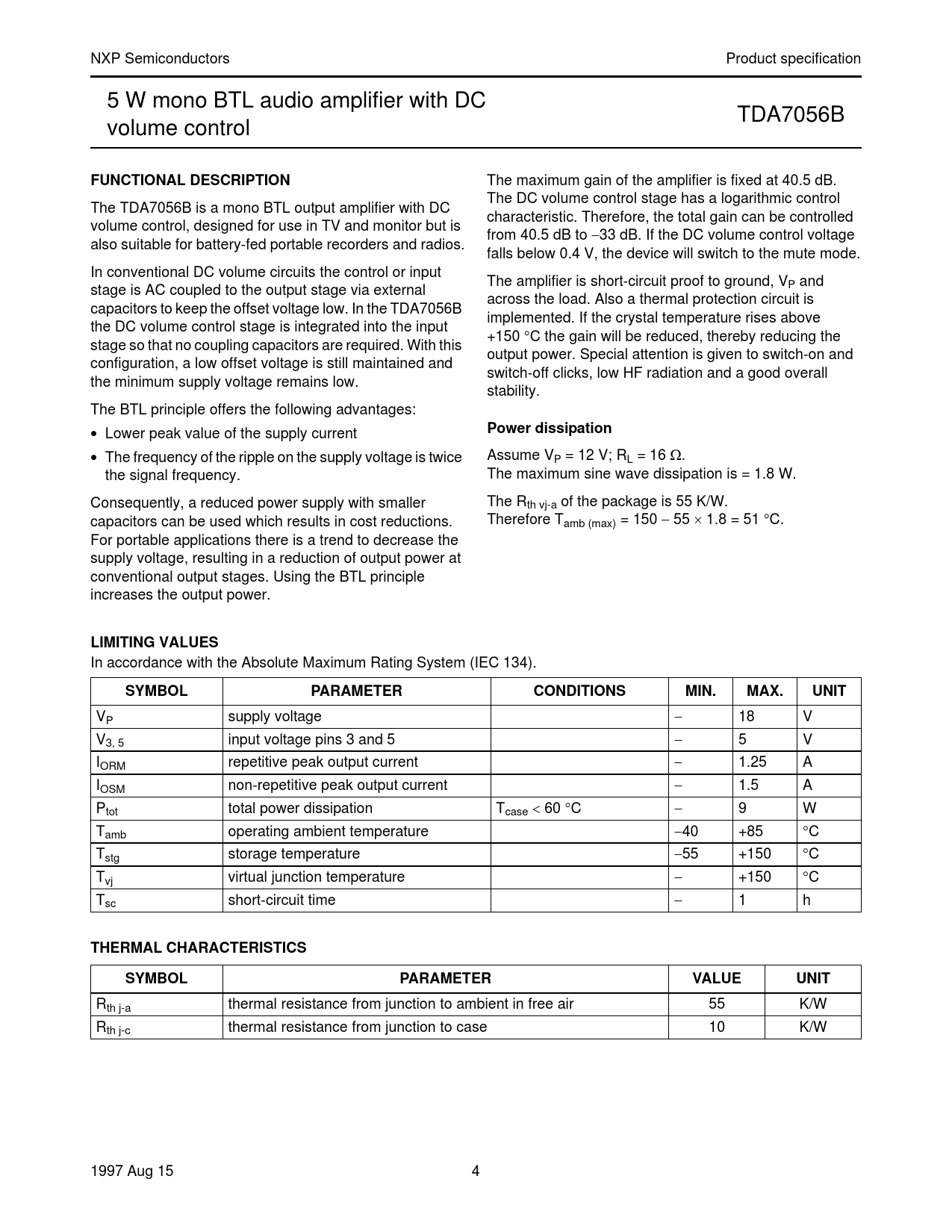 NXP Semiconductors Product specification 5 W mono BTL audio amplifier with DC TDA7056B volume control FUNCTIONAL DESCRIPTION The maximum gain of the amplifier is fixed at 40.5 dB. The DC volume control stage has a logarithmic control The TDA7056B is a mono BTL output amplifier with DC characteristic. Therefore, the total gain can be controlled volume control, designed for use in TV and monitor but is from 40.5 dB to 33 dB. If the DC volume control voltage also suitable for battery-fed portable recorders and radios. falls below 0.4 V, the device will switch to the mute mode. In conventional DC volume circuits the control or input The amplifier is short-circuit proof to ground, V stage is AC coupled to the output stage via external P and across the load. Also a thermal protection circuit is capacitors to keep the offset voltage low. In the TDA7056B implemented. If the crystal temperature rises above the DC volume control stage is integrated into the input +150 C the gain will be reduced, thereby reducing the stage so that no coupling capacitors are required. With this output power. Special attention is given to switch-on and configuration, a low offset voltage is still maintained and switch-off clicks, low HF radiation and a good overall the minimum supply voltage remains low. stability. The BTL principle offers the following advantages: Lower peak value of the supply current Power dissipation The frequency of the ripple on the supply voltage is twice Assume VP = 12 V; RL = 16 . the signal frequency. The maximum sine wave dissipation is = 1.8 W. Consequently, a reduced power supply with smaller The Rth vj-a of the package is 55 K/W. capacitors can be used which results in cost reductions. Therefore Tamb (max) = 150 55 1.8 = 51 C. For portable applications there is a trend to decrease the supply voltage, resulting in a reduction of output power at conventional output stages. Using the BTL principle increases the output power. LIMITING VALUES In accordance with the Absolute Maximum Rating System (IEC 134). SYMBOLPARAMETERCONDITIONSMIN.MAX.UNIT VP supply voltage 18 V V3, 5 input voltage pins 3 and 5 5 V IORM repetitive peak output current 1.25 A IOSM non-repetitive peak output current 1.5 A P tot total power dissipation Tcase 60 C 9 W Tamb operating ambient temperature 40 +85 C Tstg storage temperature 55 +150 C Tvj virtual junction temperature +150 C Tsc short-circuit time 1 h THERMAL CHARACTERISTICSSYMBOLPARAMETERVALUEUNIT Rth j-a thermal resistance from junction to ambient in free air 55 K/W Rth j-c thermal resistance from junction to case 10 K/W 1997 Aug 15 4 Document Outline Features General description Quick reference data Ordering information Block diagram Pinning Functional description Power dissipation Limiting values Thermal characteristics Characteristics Test and application information Package outline Soldering Introduction Soldering by dipping or by wave Repairing soldered joints Data sheet status Definitions Disclaimers
