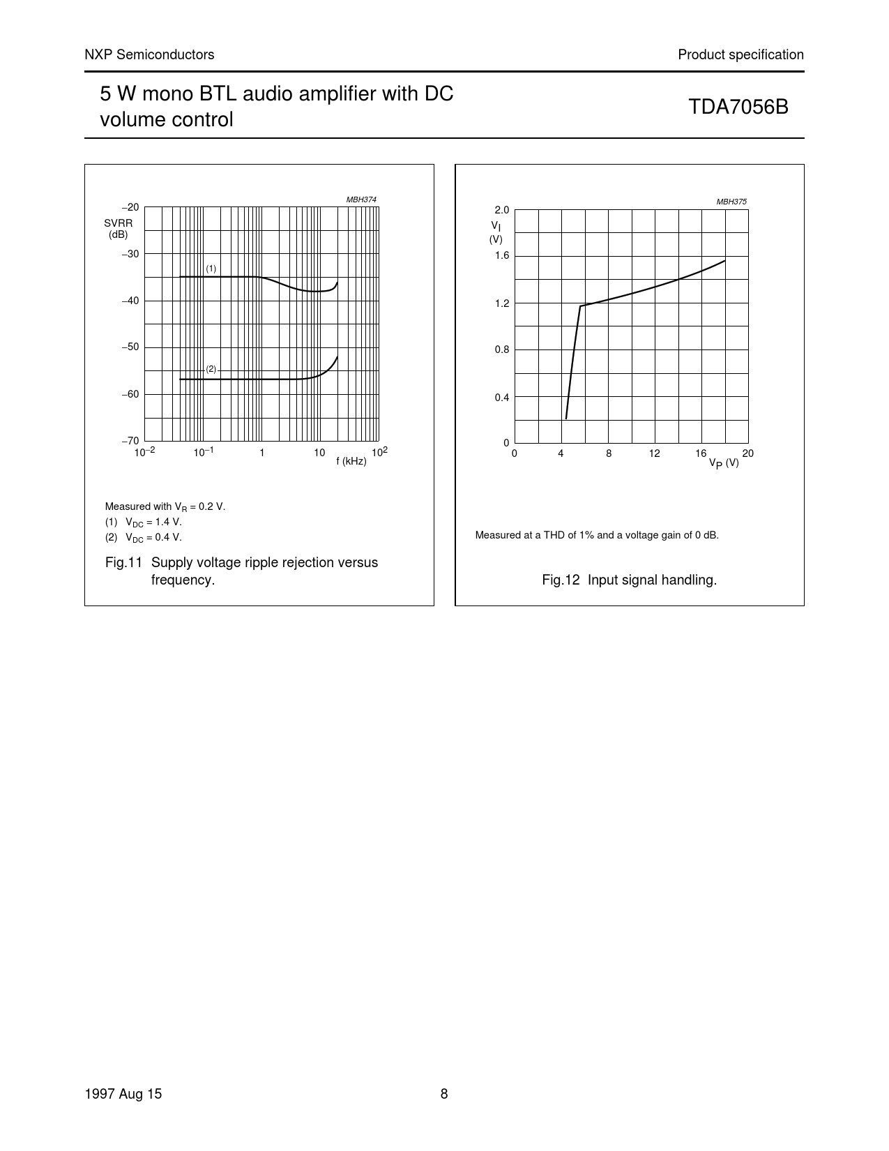 NXP Semiconductors Product specification 5 W mono BTL audio amplifier with DC TDA7056B volume control MBH374 − MBH375 20 handbook, halfpage 2.0 handbook, halfpage SVRR VI (dB) (V) −30 1.6 (1) −40 1.2 −50 0.8 (2) −60 0.4 −70 0 10−2 10−1 1 10 102 0 4 8 12 16 20 f (kHz) VP (V) Measured with VR = 0.2 V. (1) VDC = 1.4 V. (2) V Measured at a THD of 1% and a voltage gain of 0 dB. DC = 0.4 V. Fig.11 Supply voltage ripple rejection versus frequency. Fig.12 Input signal handling. 1997 Aug 15 8 Document Outline Features General description Quick reference data Ordering information Block diagram Pinning Functional description Power dissipation Limiting values Thermal characteristics Characteristics Test and application information Package outline Soldering Introduction Soldering by dipping or by wave Repairing soldered joints Data sheet status Definitions Disclaimers
