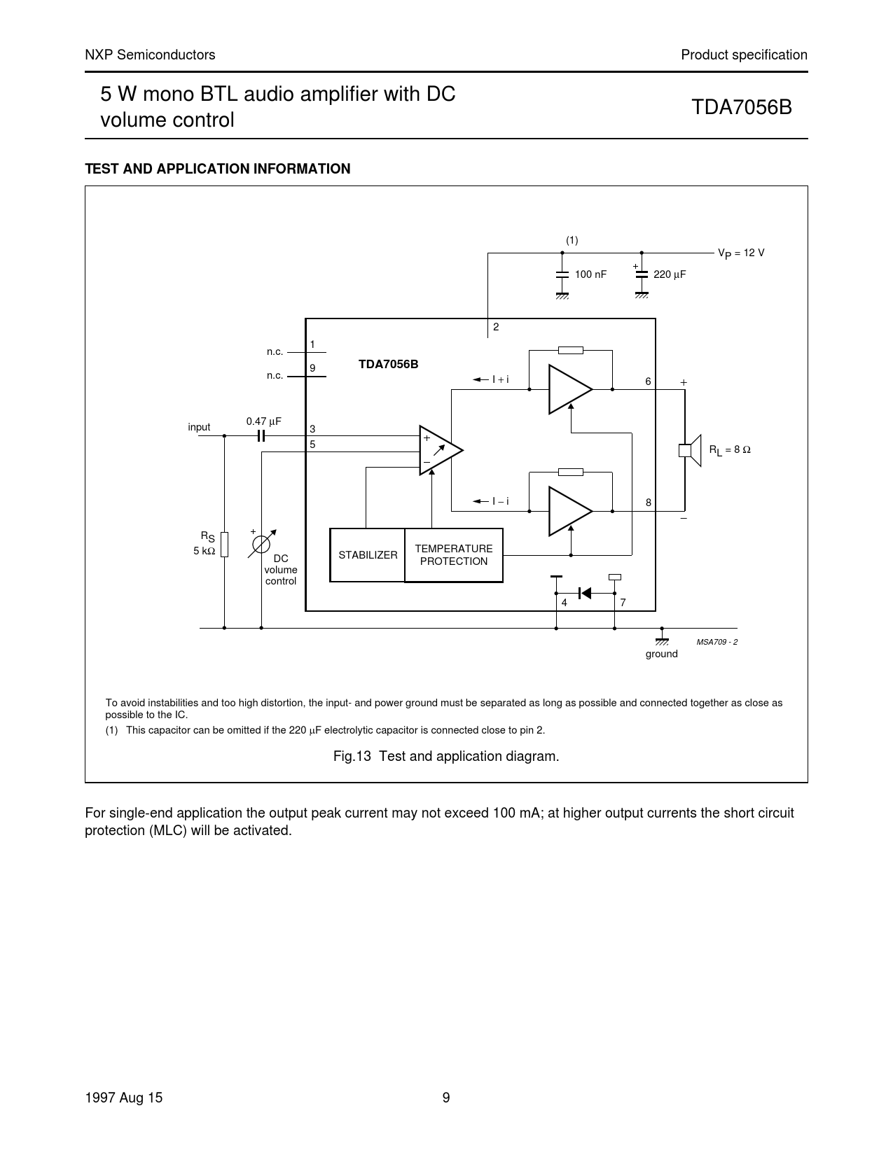 NXP Semiconductors Product specification 5 W mono BTL audio amplifier with DC TDA7056B volume control TEST AND APPLICATION INFORMATION (1) V handbook, full pagewidth P = 12 V 100 nF 220 μF 2 1 n.c. TDA7056B 9 n.c. I + i 6 + 0.47 μF input 3 5 RL = 8 Ω I − i 8 − RS 5 kΩ TEMPERATURE STABILIZER DC PROTECTION volume control 4 7 MSA709 - 2 ground To avoid instabilities and too high distortion, the input- and power ground must be separated as long as possible and connected together as close as possible to the IC. (1) This capacitor can be omitted if the 220 F electrolytic capacitor is connected close to pin 2. Fig.13 Test and application diagram. For single-end application the output peak current may not exceed 100 mA; at higher output currents the short circuit protection (MLC) will be activated. 1997 Aug 15 9 Document Outline Features General description Quick reference data Ordering information Block diagram Pinning Functional description Power dissipation Limiting values Thermal characteristics Characteristics Test and application information Package outline Soldering Introduction Soldering by dipping or by wave Repairing soldered joints Data sheet status Definitions Disclaimers