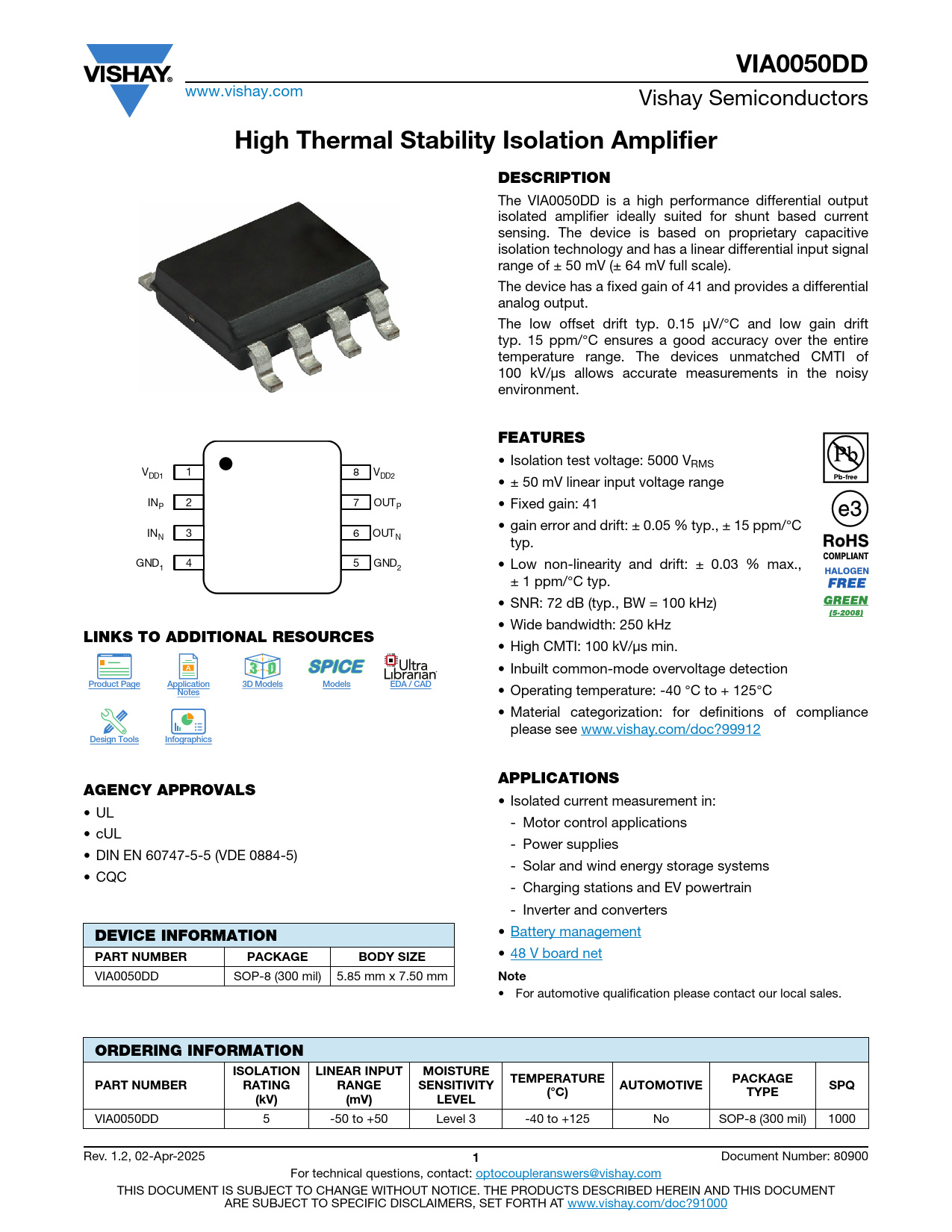 VIA0050DD 5 -50 to +50 Level 3 -40 to +125 No SOP-8 (300 mil) 1000 Rev. 1.2, 02-Apr-2025