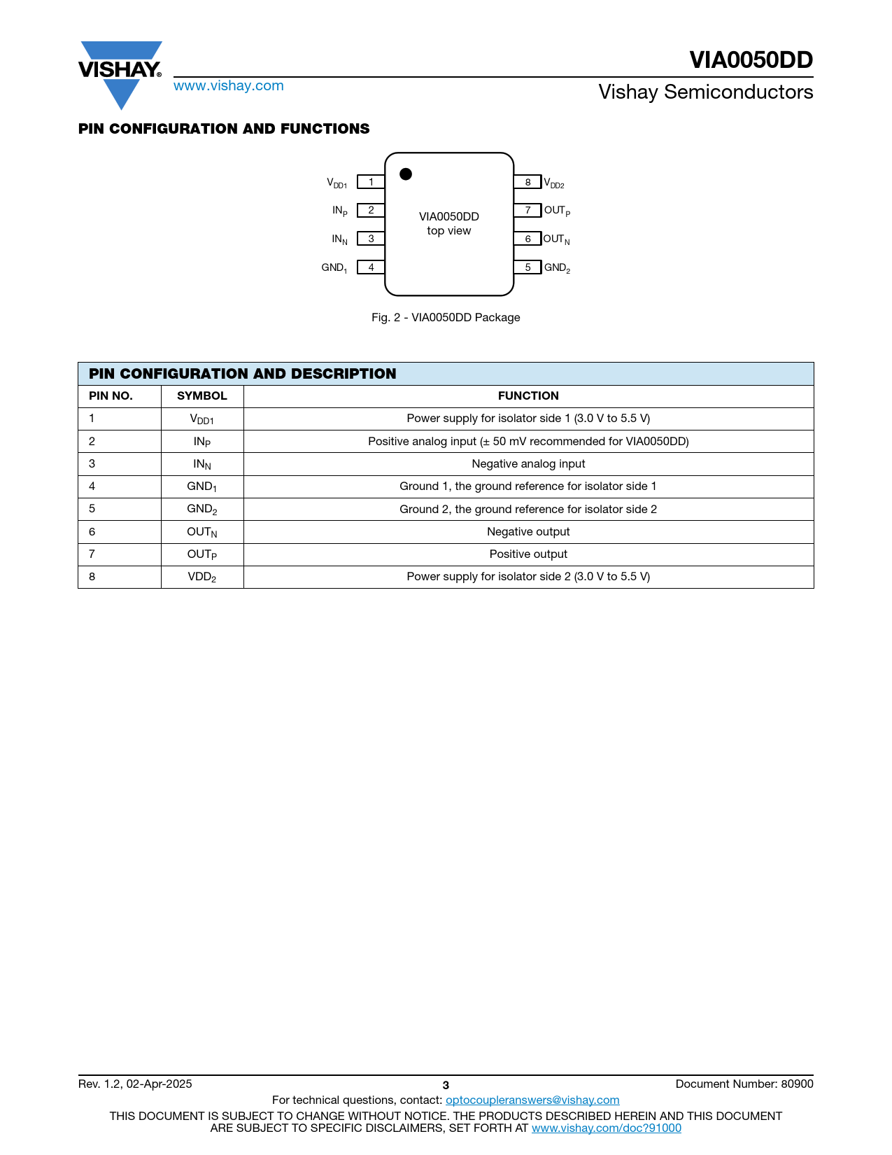 VIA0050DD www.vishay.com Vishay Semiconductors PIN CONFIGURATION AND FUNCTIONS V 1 8 V DD1 DD2 IN 2 7 OUT P P VIA0050DD top view IN 3 6 OUT N N GND 4 5 GND 1 2 Fig. 2 - VIA0050DD Package PIN CONFIGURATION AND DESCRIPTION PIN NO.SYMBOLFUNCTION 1 VDD1 Power supply for isolator side 1 (3.0 V to 5.5 V) 2 INP Positive analog input (± 50 mV recommended for VIA0050DD) 3 INN Negative analog input 4 GND1 Ground 1, the ground reference for isolator side 1 5 GND2 Ground 2, the ground reference for isolator side 2 6 OUTN Negative output 7 OUTP Positive output 8 VDD2 Power supply for isolator side 2 (3.0 V to 5.5 V) Rev. 1.2, 02-Apr-2025 3 Document Number: 80900 For technical questions, contact: optocoupleranswers@vishay.com THIS DOCUMENT IS SUBJECT TO CHANGE WITHOUT NOTICE. THE PRODUCTS DESCRIBED HEREIN AND THIS DOCUMENT ARE SUBJECT TO SPECIFIC DISCLAIMERS, SET FORTH AT www.vishay.com/doc?91000