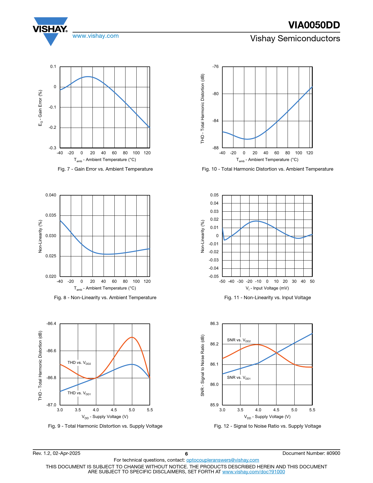 VIA0050DD www.vishay.com Vishay Semiconductors Axis Title Axis Title 0.1 10000 -76 10000 ) (dB n 0 o ) 1000 (% torti -80 1000 is D rror ne ne ine c ne ne E -0.1 ine n oni 1st li 2nd li 2nd l 1st li rm 2nd li Gai 2nd l a - 100 H -84 100 GE tal -0.2 o - T D H T -0.3 10 -88 10 -40 -20 0 20 40 60 80 100 120 -40 -20 0 20 40 60 80 100 120 T - Ambient Temperature (°C) T - Ambient Temperature (°C) amb amb Fig. 7 - Gain Error vs. Ambient Temperature Fig. 10 - Total Harmonic Distortion vs. Ambient Temperature Axis Title Axis Title 0.040 10000 0.05 10000 0.04 0.03 0.035 ) 0.02 1000 1000 (% (% 0.01 ty ty ne ne ine ne ne ine 0.030 0 neari 1st li neari 2nd l 2nd li 1st li 2nd l 2nd li -0.01 n-Li 100 o 100 Non-Li N -0.02 0.025 -0.03 -0.04 0.020 10 -0.05 10 -40 -20 0 20 40 60 80 100 120 -50 -40 -30 -20 -10 0 10 20 30 40 50 T - Ambient Temperature (°C) V - Input Voltage (mV) amb I Fig. 8 - Non-Linearity vs. Ambient Temperature Fig. 11 - Non-Linearity vs. Input Voltage Axis Title Axis Title -86.4 10000 86.3 10000 ) (dB B) n d SNR vs. VDD2 o 86.2 torti -86.6 1000 1000 is Ratio ( D c ne ne ise ne ine THD vs. V ne ine oni DD2 86.1 No 1st li rm 2nd li 1st li 2nd l 2nd li a 2nd l l to a H -86.8 100 n SNR vs. VDD1 100 tal o - Sig 86.0 - T D THD vs. VDD1 H SNR T -87.0 10 85.9 10 3.0 3.5 4.0 4.5 5.0 5.5 3.0 3.5 4.0 4.5 5.0 5.5 V - Supply Voltage (V) V - Supply Voltage (V) DD DD Fig. 9 - Total Harmonic Distortion vs. Supply Voltage Fig. 12 - Signal to Noise Ratio vs. Supply Voltage Rev. 1.2, 02-Apr-2025 6 Document Number: 80900 For technical questions, contact: optocoupleranswers@vishay.com THIS DOCUMENT IS SUBJECT TO CHANGE WITHOUT NOTICE. THE PRODUCTS DESCRIBED HEREIN AND THIS DOCUMENT ARE SUBJECT TO SPECIFIC DISCLAIMERS, SET FORTH AT www.vishay.com/doc?91000