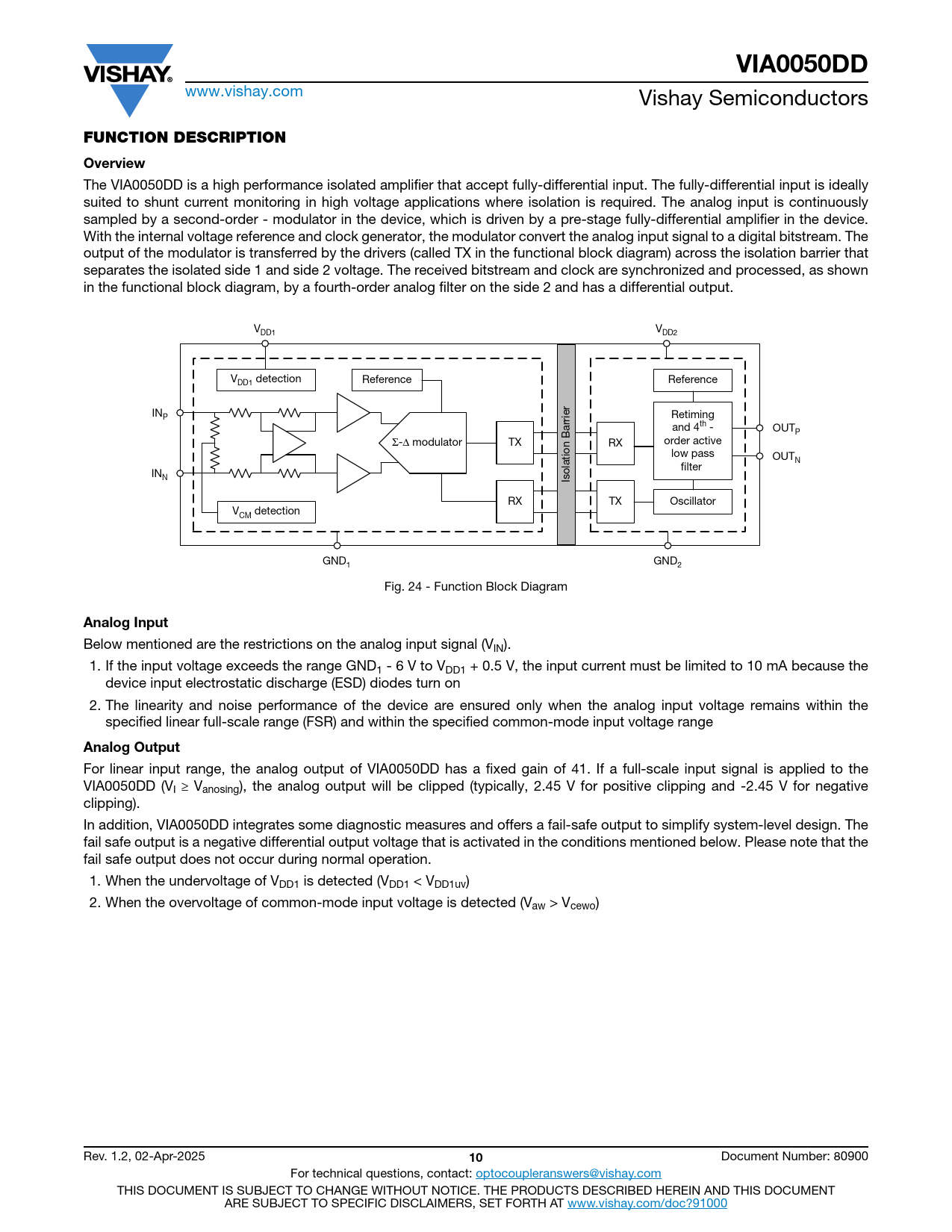 VIA0050DD www.vishay.com Vishay Semiconductors FUNCTION DESCRIPTION Overview The VIA0050DD is a high performance isolated amplifier that accept fully-differential input. The fully-differential input is ideally suited to shunt current monitoring in high voltage applications where isolation is required. The analog input is continuously sampled by a second-order - modulator in the device, which is driven by a pre-stage fully-differential amplifier in the device. With the internal voltage reference and clock generator, the modulator convert the analog input signal to a digital bitstream. The output of the modulator is transferred by the drivers (called TX in the functional block diagram) across the isolation barrier that separates the isolated side 1 and side 2 voltage. The received bitstream and clock are synchronized and processed, as shown in the functional block diagram, by a fourth-order analog filter on the side 2 and has a differential output. V V DD1 DD2 V detection DD1 Reference Reference INP Retiming and 4th - OUTP Σ-Δ modulator TX RX order active low pass OUTN filter INN Isolation Barrier RX TX Oscillator V detection CM GND GND 1 2 Fig. 24 - Function Block Diagram Analog Input Below mentioned are the restrictions on the analog input signal (VIN). 1. If the input voltage exceeds the range GND1 - 6 V to VDD1 + 0.5 V, the input current must be limited to 10 mA because the device input electrostatic discharge (ESD) diodes turn on 2. The linearity and noise performance of the device are ensured only when the analog input voltage remains within the specified linear full-scale range (FSR) and within the specified common-mode input voltage range Analog Output For linear input range, the analog output of VIA0050DD has a fixed gain of 41. If a full-scale input signal is applied to the VIA0050DD (VI ≥ Vanosing), the analog output will be clipped (typically, 2.45 V for positive clipping and -2.45 V for negative clipping). In addition, VIA0050DD integrates some diagnostic measures and offers a fail-safe output to simplify system-level design. The fail safe output is a negative differential output voltage that is activated in the conditions mentioned below. Please note that the fail safe output does not occur during normal operation. 1. When the undervoltage of VDD1 is detected (VDD1 < VDD1uv) 2. When the overvoltage of common-mode input voltage is detected (Vaw > Vcewo) Rev. 1.2, 02-Apr-2025 10 Document Number: 80900 For technical questions, contact: optocoupleranswers@vishay.com THIS DOCUMENT IS SUBJECT TO CHANGE WITHOUT NOTICE. THE PRODUCTS DESCRIBED HEREIN AND THIS DOCUMENT ARE SUBJECT TO SPECIFIC DISCLAIMERS, SET FORTH AT www.vishay.com/doc?91000