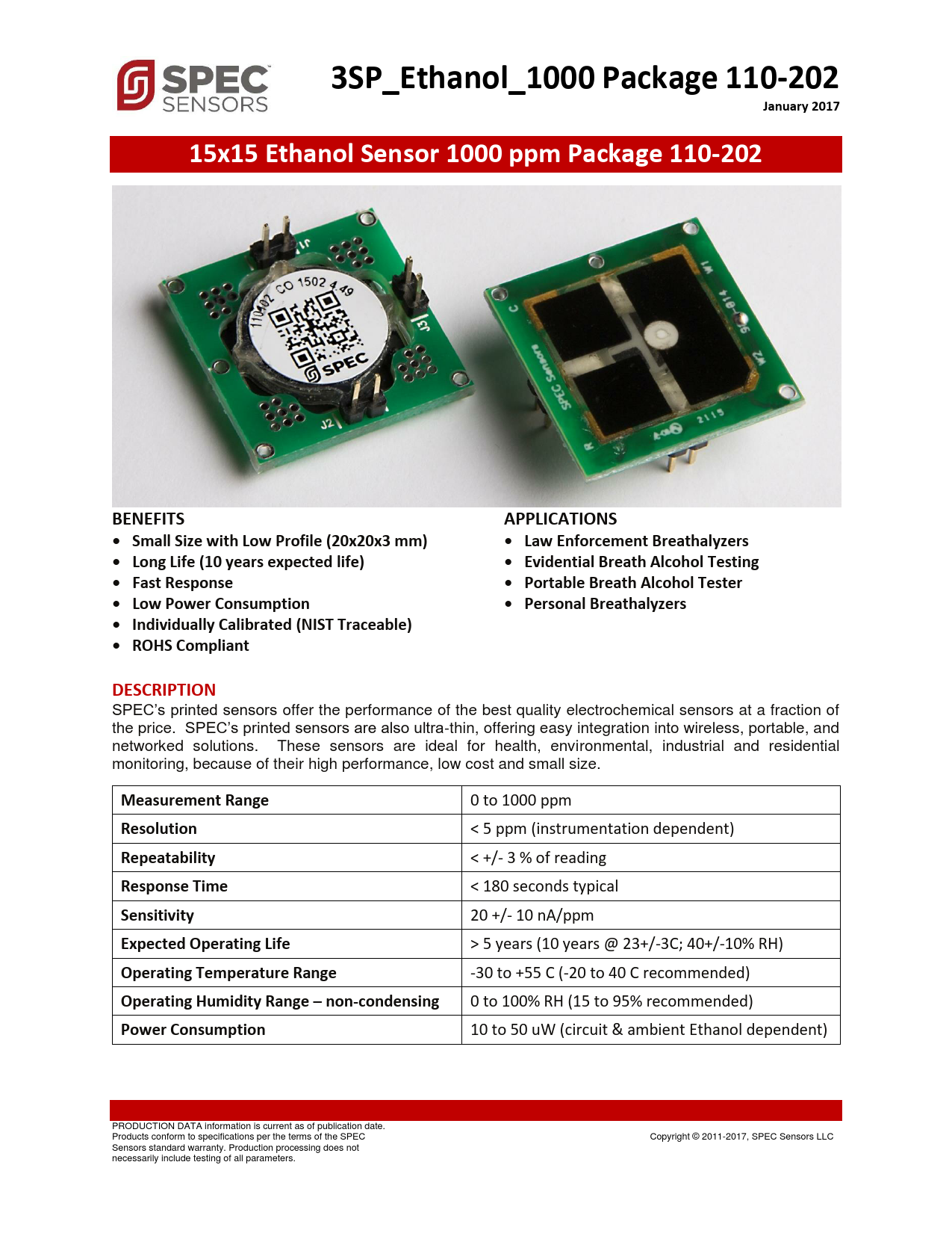 3SP_Ethanol_1000 Package 110-202. January 2017. 15x15 Ethanol Sensor 1000 ppm Package 110-202. BENEFITS. APPLICATIONS
