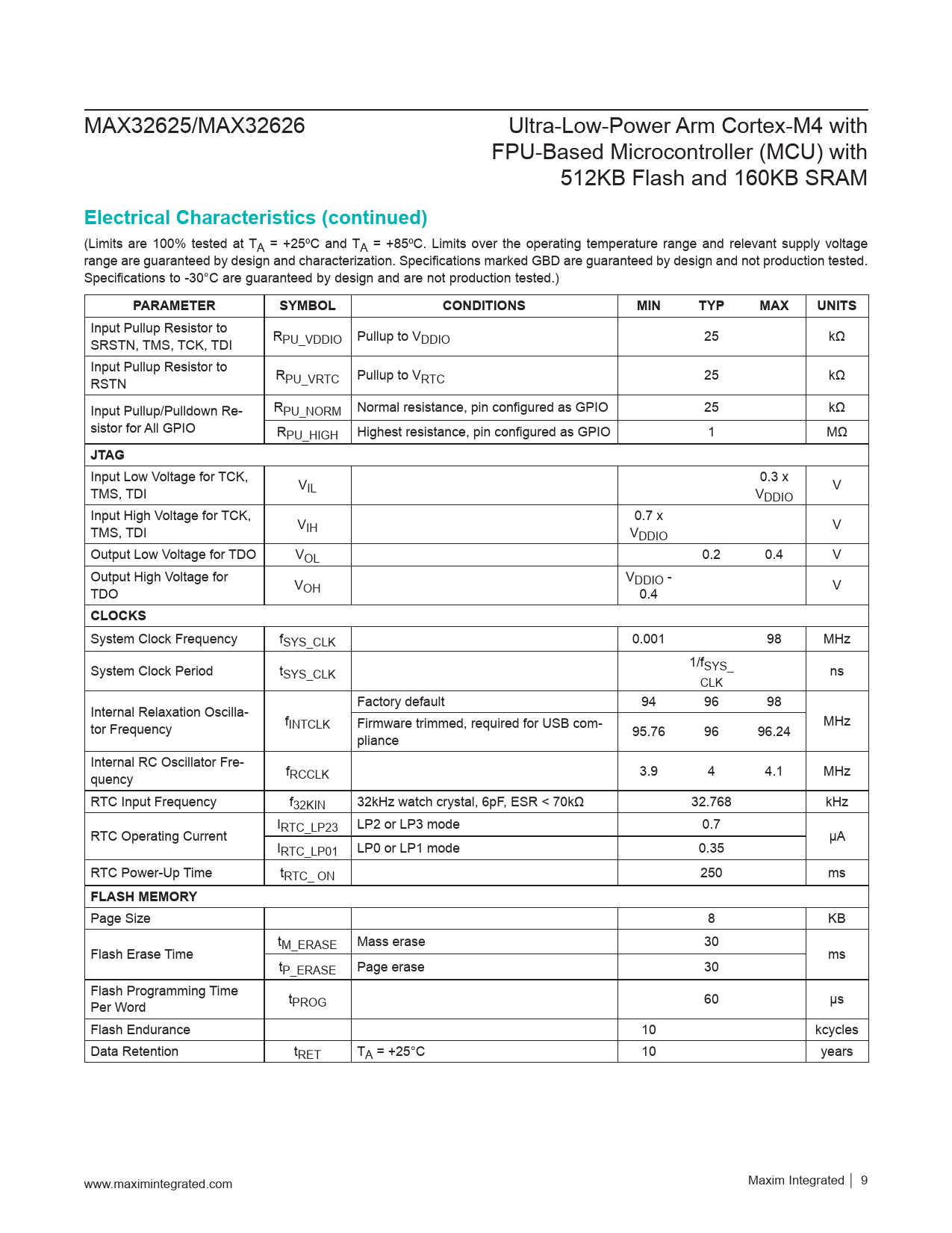 Page Size 8 KB tM_ERASE Mass erase 30 Flash Erase Time ms tP_ERASE Page erase 30 Flash Programming Time Per Word tPROG 60 μs Flash Endurance 10 kcycles Data Retention tRET TA = +25°C 10 years www.maximintegrated.com Maxim Integrated │ 9 Document Outline General Description Applications Benefits and Features Simplified Block Diagram Absolute Maximum Ratings Package Information 63 WLP 68 TQFN Electrical Characteristics Electrical Characteristics - ADC Electrical Characteristics - USB Electrical Characteristics - SPI Master / SPIX Master Electrical Characteristics - SPI Slave Electrical Characteristics - I2C Bus Pin Configurations Pin Description Detailed Description MAX32625/MAX32626 ARM Cortex-M4 with FPU Processor Power Operating Modes Low Power Mode 0 (LP0) Low Power Mode 1 (LP1) Low Power Mode 2 (LP2) Low Power Mode 3 (LP3) Analog-to-Digital Converter Pulse Train Engine Clocking Scheme Interrupt Sources Real-Time Clock and Wake-Up Timer General-Purpose I/O and Special Function Pins CRC Module Watchdog Timers Programmable Timers Serial Peripherals USB I2C Master and Slave SPI (Master) SPI (Slave) SPI (Execute in Place (SPIX) Master) UART 1-Wire Master Peripheral Management Unit (PMU) Additional Documentation Development and Technical Support Trust Protection Unit (TPU) (MAX32626 Only) Applications Information General-Purpose I/O Matrix Typical Application Circuit Ordering Information Revision History