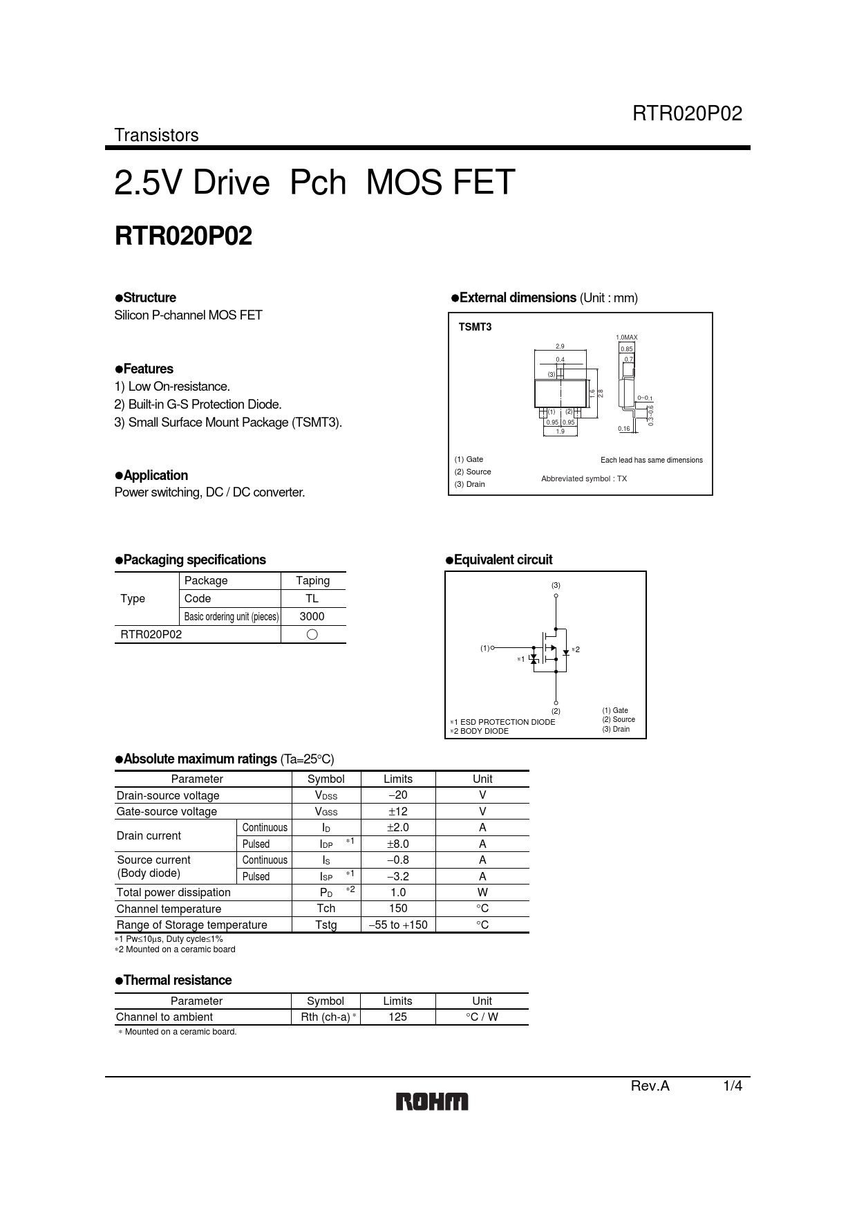 Pages / Page5 / 1 — RTR020P02. Structure. External dimensions. TSMT3. Features. Application. …