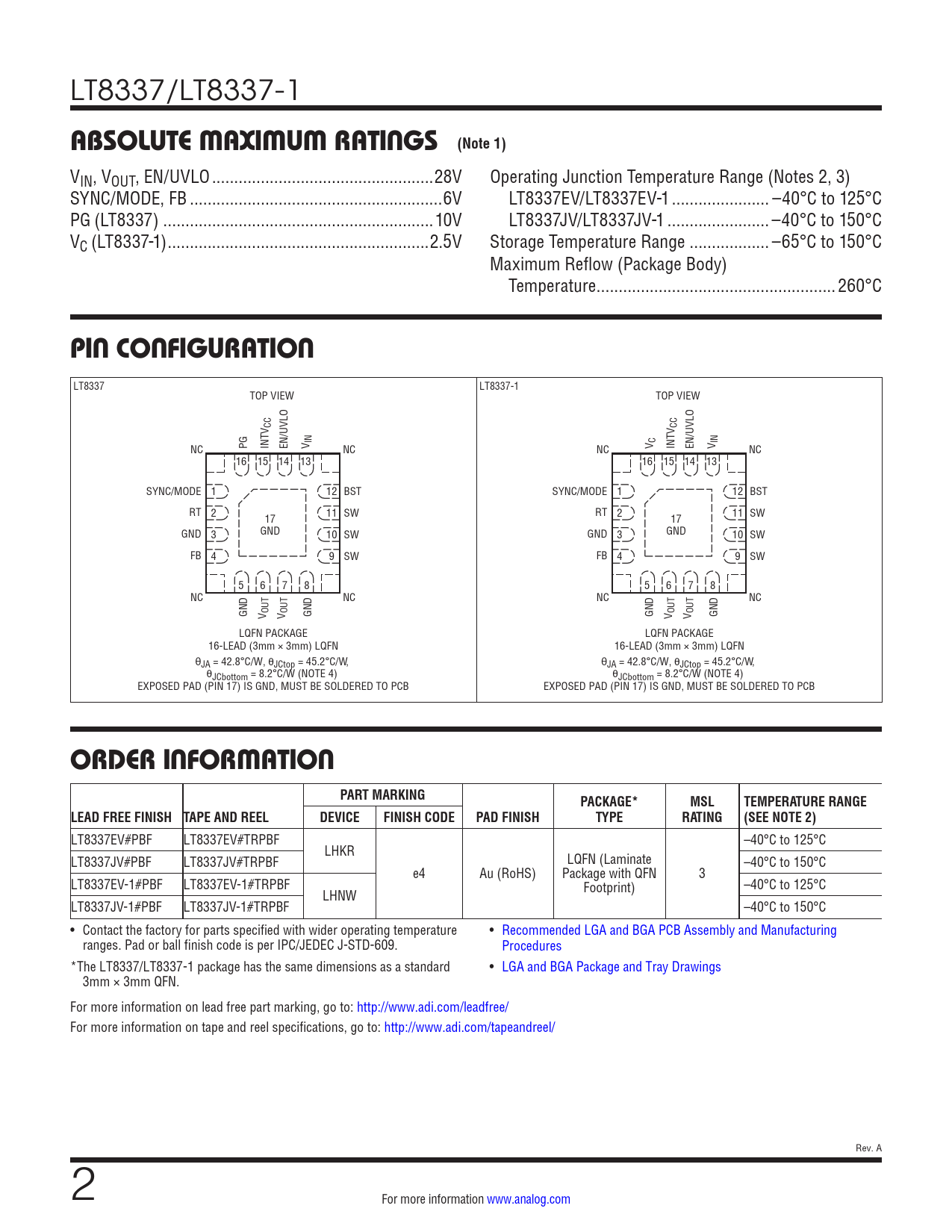 LT8337/LT8337-1 ABSOLUTE MAXIMUM RATINGS (Note 1) VIN, VOUT, EN/UVLO ..28V Operating Junction Temperature Range (Notes 2, 3) SYNC/MODE, FB ...6V LT8337EV/LT8337EV-1 .. –40°C to 125°C PG (LT8337) ...10V LT8337JV/LT8337JV-1 ... –40°C to 150°C VC (LT8337-1) ...2.5V Storage Temperature Range .. –65°C to 150°C Maximum Reflow (Package Body) Temperature ..260°C PIN CONFIGURATION LT8337 LT8337-1 TOP VIEW TOP VIEW CC CC PG INTV EN/UVLO V IN NC NC V C INTV EN/UVLO V IN NC NC 16 15 14 13 16 15 14 13 SYNC/MODE 1 12 BST SYNC/MODE 1 12 BST RT 2 11 SW 17 RT 2 11 SW 17 GND 3 GND 10 SW GND 3 GND 10 SW FB 4 9 SW FB 4 9 SW 5 6 7 8 5 6 7 8 NC NC NC NC GND V OUT V OUT GND GND V OUT V OUT GND LQFN PACKAGE LQFN PACKAGE 16-LEAD (3mm × 3mm) LQFN 16-LEAD (3mm × 3mm) LQFN θJA = 42.8°C/W, θJCtop = 45.2°C/W, θJA = 42.8°C/W, θJCtop = 45.2°C/W, θJCbottom = 8.2°C/W (NOTE 4) θJCbottom = 8.2°C/W (NOTE 4) EXPOSED PAD (PIN 17) IS GND, MUST BE SOLDERED TO PCB EXPOSED PAD (PIN 17) IS GND, MUST BE SOLDERED TO PCB ORDER INFORMATIONPART MARKINGPACKAGE*MSLTEMPERATURE RANGELEAD FREE FINISH TAPE AND REELDEVICEFINISH CODEPAD FINISHTYPERATING(SEE NOTE 2) LT8337EV#PBF LT8337EV#TRPBF –40°C to 125°C LHKR LT8337JV#PBF LT8337JV#TRPBF LQFN (Laminate –40°C to 150°C e4 Au (RoHS) Package with QFN 3 LT8337EV-1#PBF LT8337EV-1#TRPBF Footprint) –40°C to 125°C LHNW LT8337JV-1#PBF LT8337JV-1#TRPBF –40°C to 150°C • Contact the factory for parts specified with wider operating temperature • Recommended LGA and BGA PCB Assembly and Manufacturing ranges. Pad or ball finish code is per IPC/JEDEC J-STD-609. Procedures *The LT8337/LT8337-1 package has the same dimensions as a standard • LGA and BGA Package and Tray Drawings 3mm × 3mm QFN. For more information on lead free part marking, go to: http://www.adi.com/leadfree/ For more information on tape and reel specifications, go to: http://www.adi.com/tapeandreel/ Rev. A 2 For more information www.analog.com Document Outline Features Applications Typical Application Description Absolute Maximum Ratings Pin Configuration Order Information Electrical Characteristics Typical Performance Characteristics Pin Functions Block Diagram Operation Applications Information Typical Applications Package Description Typical Application Related Parts
