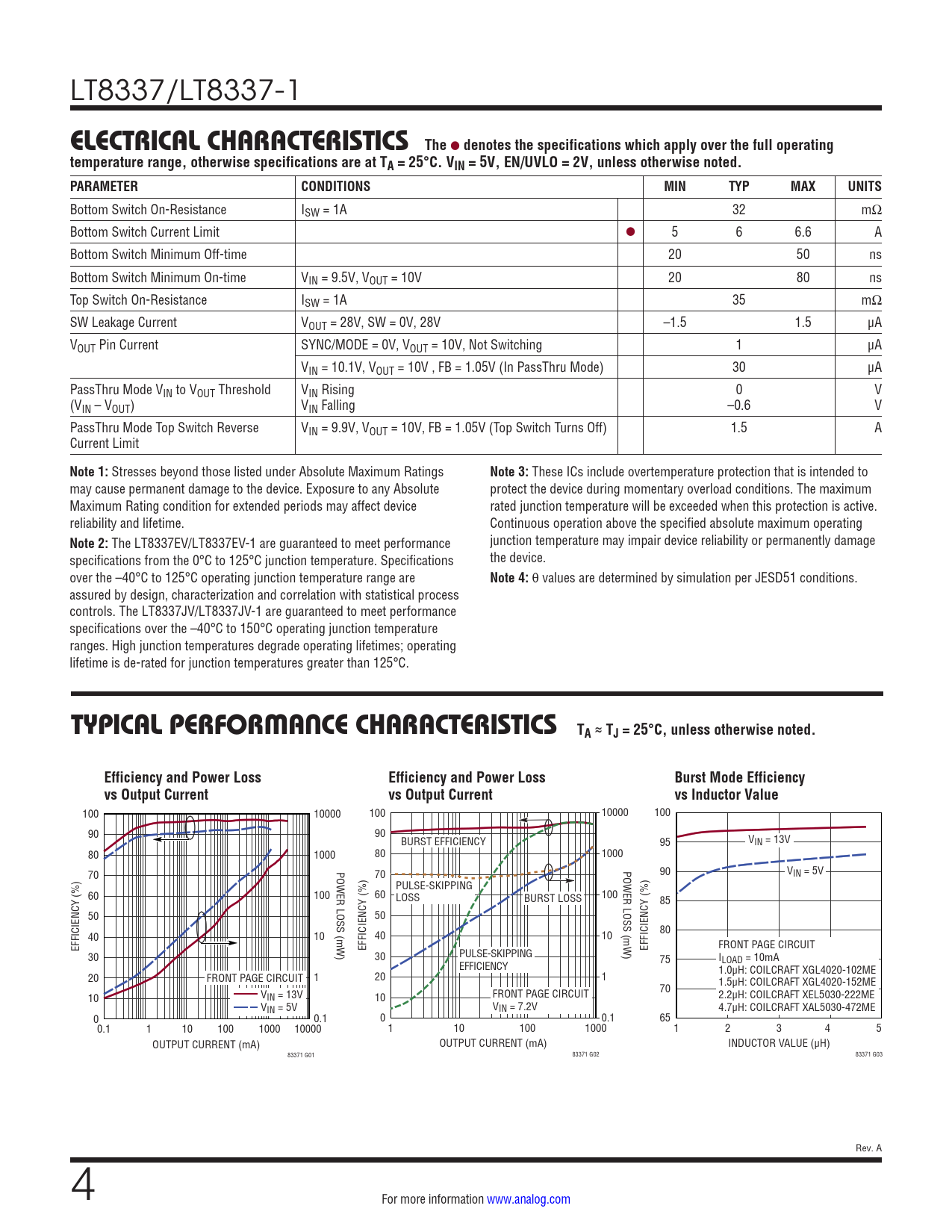 LT8337/LT8337-1 ELECTRICAL CHARACTERISTICSThe l denotes the specifications which apply over the full operatingtemperature range, otherwise specifications are at TA = 25°C. VIN = 5V, EN/UVLO = 2V, unless otherwise noted. PARAMETERCONDITIONSMINTYPMAXUNITS Bottom Switch On-Resistance ISW = 1A 32 mΩ Bottom Switch Current Limit l 5 6 6.6 A Bottom Switch Minimum Off-time 20 50 ns Bottom Switch Minimum On-time VIN = 9.5V, VOUT = 10V 20 80 ns Top Switch On-Resistance ISW = 1A 35 mΩ SW Leakage Current VOUT = 28V, SW = 0V, 28V –1.5 1.5 μA VOUT Pin Current SYNC/MODE = 0V, VOUT = 10V, Not Switching 1 μA VIN = 10.1V, VOUT = 10V , FB = 1.05V (In PassThru Mode) 30 μA PassThru Mode VIN to VOUT Threshold VIN Rising 0 V (VIN – VOUT) VIN Falling –0.6 V PassThru Mode Top Switch Reverse VIN = 9.9V, VOUT = 10V, FB = 1.05V (Top Switch Turns Off) 1.5 A Current Limit Note 1: Stresses beyond those listed under Absolute Maximum Ratings Note 3: These ICs include overtemperature protection that is intended to may cause permanent damage to the device. Exposure to any Absolute protect the device during momentary overload conditions. The maximum Maximum Rating condition for extended periods may affect device rated junction temperature will be exceeded when this protection is active. reliability and lifetime. Continuous operation above the specified absolute maximum operating Note 2: The LT8337EV/LT8337EV-1 are guaranteed to meet performance junction temperature may impair device reliability or permanently damage specifications from the 0°C to 125°C junction temperature. Specifications the device. over the –40°C to 125°C operating junction temperature range are Note 4: θ values are determined by simulation per JESD51 conditions. assured by design, characterization and correlation with statistical process controls. The LT8337JV/LT8337JV-1 are guaranteed to meet performance specifications over the –40°C to 150°C operating junction temperature ranges. High junction temperatures degrade operating lifetimes; operating lifetime is de-rated for junction temperatures greater than 125°C. TYPICAL PERFORMANCE CHARACTERISTICS TA ≈ TJ = 25°C, unless otherwise noted.Efficiency and Power LossEfficiency and Power LossBurst Mode Efficiencyvs Output Currentvs Output Currentvs Inductor Value 100 10000 100 10000 100 90 90 BURST EFFICIENCY 95 VIN = 13V 80 1000 80 1000 POWER LOSS (mW) POWER LOSS (mW) 90 V 70 70 IN = 5V PULSE-SKIPPING 60 100 60 100 LOSS BURST LOSS 85 50 50 80 40 10 40 10 EFFICIENCY (%) EFFICIENCY (%) EFFICIENCY (%) FRONT PAGE CIRCUIT 30 30 PULSE-SKIPPING 75 ILOAD = 10mA EFFICIENCY 1.0μH: COILCRAFT XGL4020-102ME 20 FRONT PAGE CIRCUIT 1 20 1 70 1.5μH: COILCRAFT XGL4020-152ME VIN = 13V FRONT PAGE CIRCUIT 2.2μH: COILCRAFT XEL5030-222ME 10 10 VIN = 5V VIN = 7.2V 4.7μH: COILCRAFT XAL5030-472ME 0 0.1 0 0.1 65 0.1 1 10 100 1000 10000 1 10 100 1000 1 2 3 4 5 OUTPUT CURRENT (mA) OUTPUT CURRENT (mA) INDUCTOR VALUE (μH) 83371 G01 83371 G02 83371 G03 Rev. A 4 For more information www.analog.com Document Outline Features Applications Typical Application Description Absolute Maximum Ratings Pin Configuration Order Information Electrical Characteristics Typical Performance Characteristics Pin Functions Block Diagram Operation Applications Information Typical Applications Package Description Typical Application Related Parts