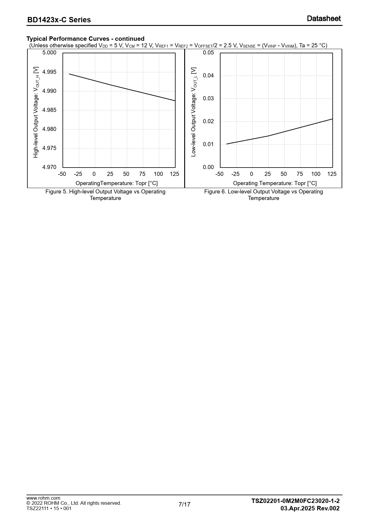 (Unless otherwise specified VDD = 5 V, VCM = 12 V, VREF1 = VREF2 = VOFFSET/2 = 2.5 V, VSENSE = (VVINP - VVINM), Ta = 25 °C) 5.000 0.05 [V] 4.995 [V] H L 0.04 _ _ OUT OUT 4.990 : V : V e e g g 0.03 lta lta 4.985 t Vo t Vo u u tp p 0.02 u 4.980 l O l Out ve ve -le -le 0.01 h 4.975 Hig Low 4.970 0.00 -50 -25 0 25 50 75 100 125 -50 -25 0 25 50 75 100 125 OperatingTemperature: Topr [°C] Operating Temperature: Topr [°C] Figure 5. High-level Output Voltage vs Operating Figure 6. Low-level Output Voltage vs Operating Temperature Temperature www.rohm.com