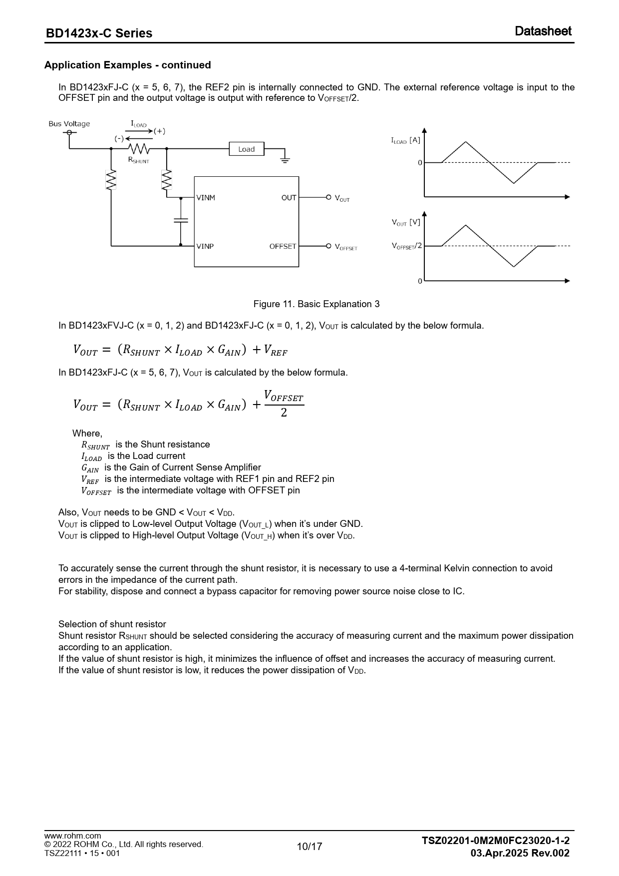 In BD1423xFJ-C (x = 5, 6, 7), the REF2 pin is internally connected to GND. The external reference voltage is input to the OFFSET pin and the output voltage is output with reference to VOFFSET/2. Figure 11. Basic Explanation 3 In BD1423xFVJ-C (x = 0, 1, 2) and BD1423xFJ-C (x = 0, 1, 2), VOUT is calculated by the below formula. 𝑉𝑂𝑈𝑇 = (𝑅𝑆𝐻𝑈𝑁𝑇 × 𝐼𝐿𝑂𝐴𝐷 × 𝐺𝐴𝐼𝑁) + 𝑉𝑅𝐸𝐹 In BD1423xFJ-C (x = 5, 6, 7), VOUT is calculated by the below formula. 𝑉 𝑉 𝑂𝐹𝐹𝑆𝐸𝑇 𝑂𝑈𝑇 = (𝑅𝑆𝐻𝑈𝑁𝑇 × 𝐼𝐿𝑂𝐴𝐷 × 𝐺𝐴𝐼𝑁) + 2 Where, 𝑅𝑆𝐻𝑈𝑁𝑇 is the Shunt resistance 𝐼𝐿𝑂𝐴𝐷 is the Load current 𝐺𝐴𝐼𝑁 is the Gain of Current Sense Amplifier 𝑉𝑅𝐸𝐹 is the intermediate voltage with REF1 pin and REF2 pin 𝑉𝑂𝐹𝐹𝑆𝐸𝑇 is the intermediate voltage with OFFSET pin Also, VOUT needs to be GND < VOUT < VDD. VOUT is clipped to Low-level Output Voltage (VOUT_L) when it’s under GND. VOUT is clipped to High-level Output Voltage (VOUT_H) when it’s over VDD. To accurately sense the current through the shunt resistor, it is necessary to use a 4-terminal Kelvin connection to avoid errors in the impedance of the current path. For stability, dispose and connect a bypass capacitor for removing power source noise close to IC. Selection of shunt resistor Shunt resistor RSHUNT should be selected considering the accuracy of measuring current and the maximum power dissipation according to an application. If the value of shunt resistor is high, it minimizes the influence of offset and increases the accuracy of measuring current. If the value of shunt resistor is low, it reduces the power dissipation of VDD. www.rohm.com