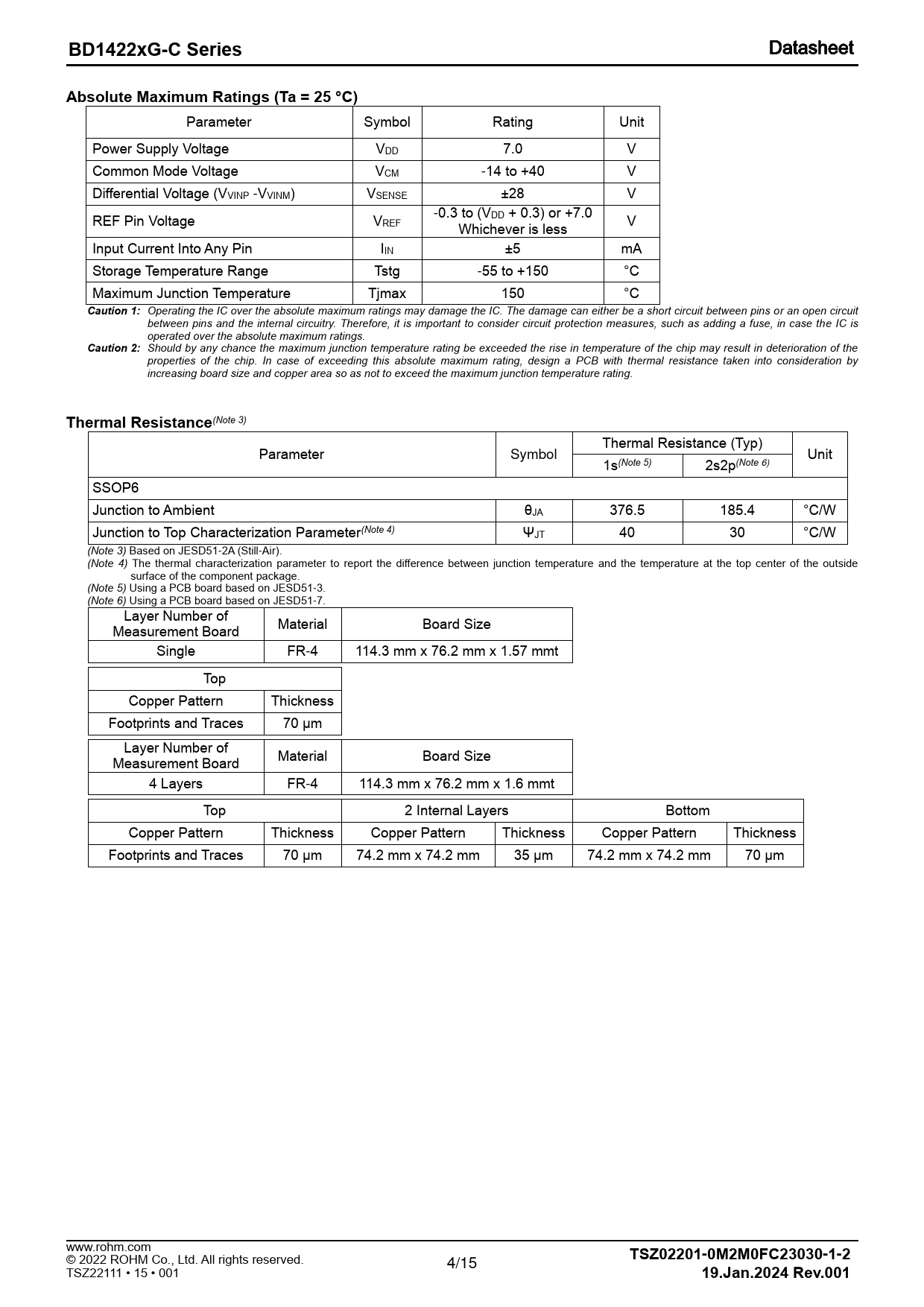 BD1422xG-C Series. Absolute Maximum Ratings (Ta = 25 °C). Caution 1:. Caution 2:. Thermal Resistance. TSZ02201. -0M2M0FC23030-1-2
