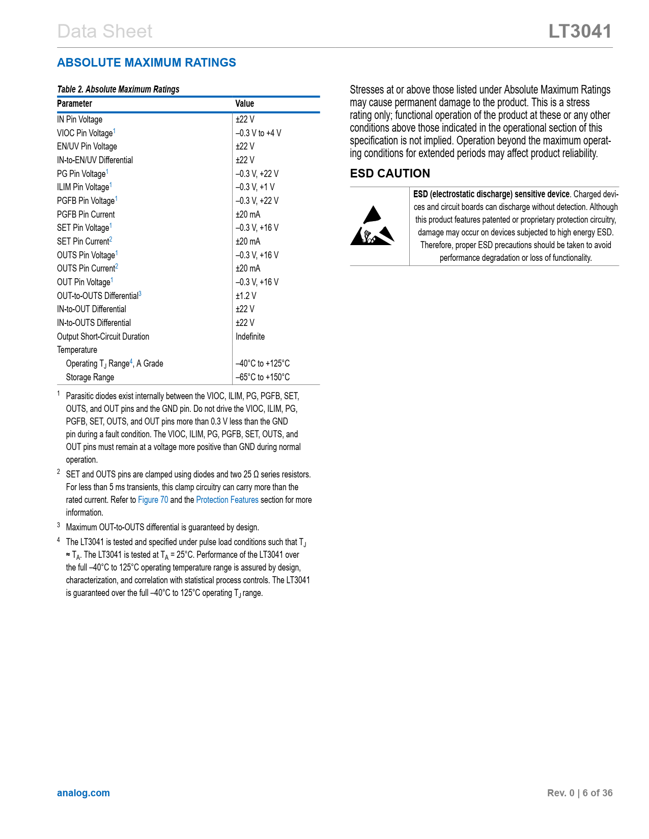 link to page 6 link to page 6 link to page 6 link to page 6 link to page 6 link to page 6 link to page 6 link to page 6 link to page 6 link to page 6 link to page 6 link to page 20 link to page 30 Data Sheet LT3041ABSOLUTE MAXIMUM RATINGSTable 2. Absolute Maximum Ratings Stresses at or above those listed under Absolute Maximum Ratings ParameterValue may cause permanent damage to the product. This is a stress IN Pin Voltage ±22 V rating only; functional operation of the product at these or any other VIOC Pin Voltage1 –0.3 V to +4 V conditions above those indicated in the operational section of this specification is not implied. Operation beyond the maximum operat- EN/UV Pin Voltage ±22 V ing conditions for extended periods may affect product reliability. IN-to-EN/UV Differential ±22 V PG Pin Voltage1 –0.3 V, +22 V ESD CAUTION ILIM Pin Voltage1 –0.3 V, +1 V ESD (electrostatic discharge) sensitive device . Charged devi- PGFB Pin Voltage1 –0.3 V, +22 V ces and circuit boards can discharge without detection. Although PGFB Pin Current ±20 mA this product features patented or proprietary protection circuitry, SET Pin Voltage1 –0.3 V, +16 V damage may occur on devices subjected to high energy ESD. SET Pin Current2 ±20 mA Therefore, proper ESD precautions should be taken to avoid OUTS Pin Voltage1 –0.3 V, +16 V performance degradation or loss of functionality. OUTS Pin Current2 ±20 mA OUT Pin Voltage1 –0.3 V, +16 V OUT-to-OUTS Differential3 ±1.2 V IN-to-OUT Differential ±22 V IN-to-OUTS Differential ±22 V Output Short-Circuit Duration Indefinite Temperature Operating TJ Range4, A Grade –40°C to +125°C Storage Range –65°C to +150°C 1 Parasitic diodes exist internally between the VIOC, ILIM, PG, PGFB, SET, OUTS, and OUT pins and the GND pin. Do not drive the VIOC, ILIM, PG, PGFB, SET, OUTS, and OUT pins more than 0.3 V less than the GND pin during a fault condition. The VIOC, ILIM, PG, PGFB, SET, OUTS, and OUT pins must remain at a voltage more positive than GND during normal operation. 2 SET and OUTS pins are clamped using diodes and two 25 Ω series resistors. For less than 5 ms transients, this clamp circuitry can carry more than the rated current. Refer to Figure 70 and the Protection Features section for more information. 3 Maximum OUT-to-OUTS differential is guaranteed by design. 4 The LT3041 is tested and specified under pulse load conditions such that TJ ≈ TA. The LT3041 is tested at TA = 25°C. Performance of the LT3041 over the full –40°C to 125°C operating temperature range is assured by design, characterization, and correlation with statistical process controls. The LT3041 is guaranteed over the full –40°C to 125°C operating TJ range. analog.comRev. 0 | 6 of 36 Document Outline Features Applications Typical Application General Description Specifications Electrical Characteristics Absolute Maximum Ratings ESD Caution Pin Configuration and Function Descriptions Typical Performance Characteristics Theory of Operation Applications Information Output Voltage Output Sensing and Stability Stability and Output Capacitance High Vibration Environments Stability and Input Capacitance PSRR and Input Capacitance Filtering High-Frequency Spikes Output Noise SET Pin (Bypass) Capacitance: Noise, PSRR, Transient Response, and Soft-Start Fast Startup EN/UV Programmable Power Good Externally Programmable Current Limit Output Overshoot Recovery Direct Paralleling for Higher Current PCB Layout Considerations High-Efficiency Linear Regulator: Voltage Input-to-Output Control (VIOC) Typical VIOC Application Thermal Considerations Calculating Junction Temperature Overload Recovery Protection Features Typical Applications Related Products Outline Dimensions Ordering Guide Evaluation Boards