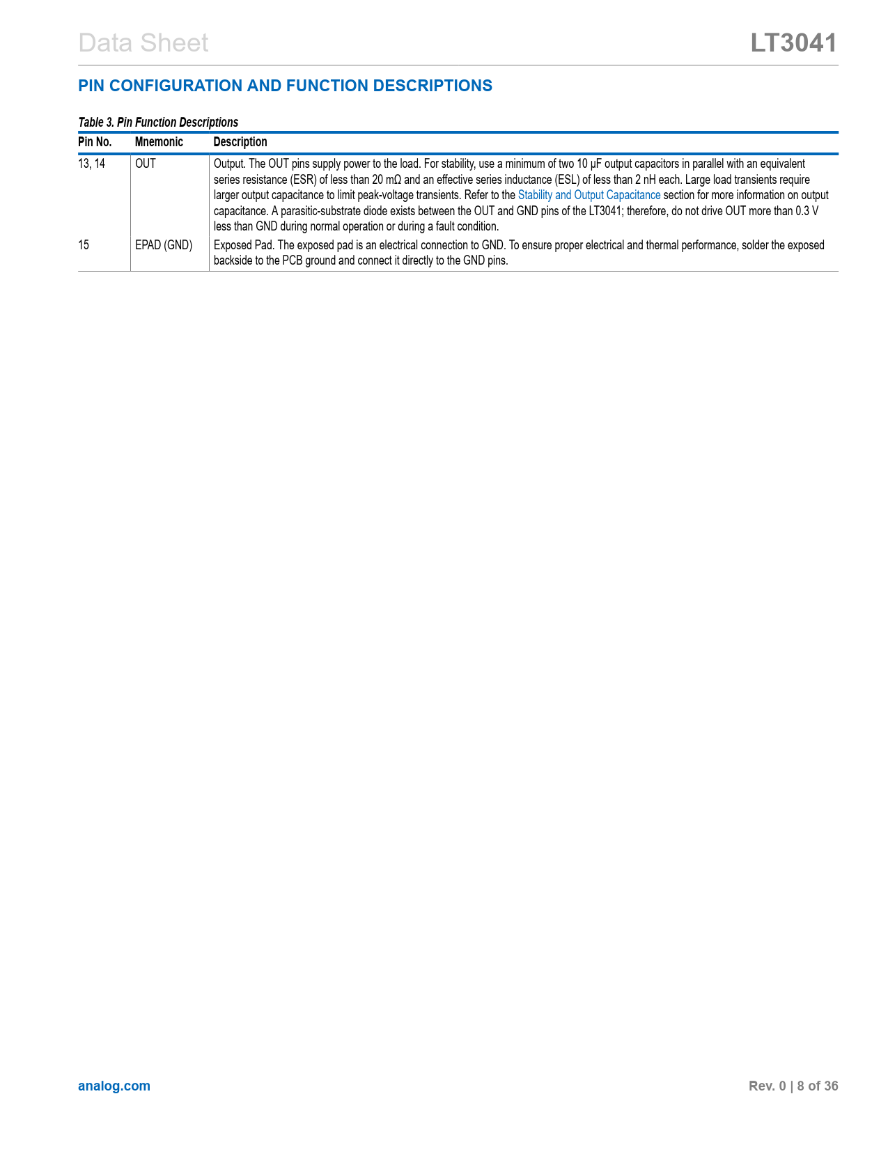 13, 14 OUT Output. The OUT pins supply power to the load. For stability, use a minimum of two 10 µF output capacitors in parallel with an equivalent series resistance (ESR) of less than 20 mΩ and an effective series inductance (ESL) of less than 2 nH each. Large load transients require larger output capacitance to limit peak-voltage transients. Refer to the Stability and Output Capacitance section for more information on output capacitance. A parasitic-substrate diode exists between the OUT and GND pins of the LT3041; therefore, do not drive OUT more than 0.3 V less than GND during normal operation or during a fault condition. 15 EPAD (GND) Exposed Pad. The exposed pad is an electrical connection to GND. To ensure proper electrical and thermal performance, solder the exposed backside to the PCB ground and connect it directly to the GND pins.