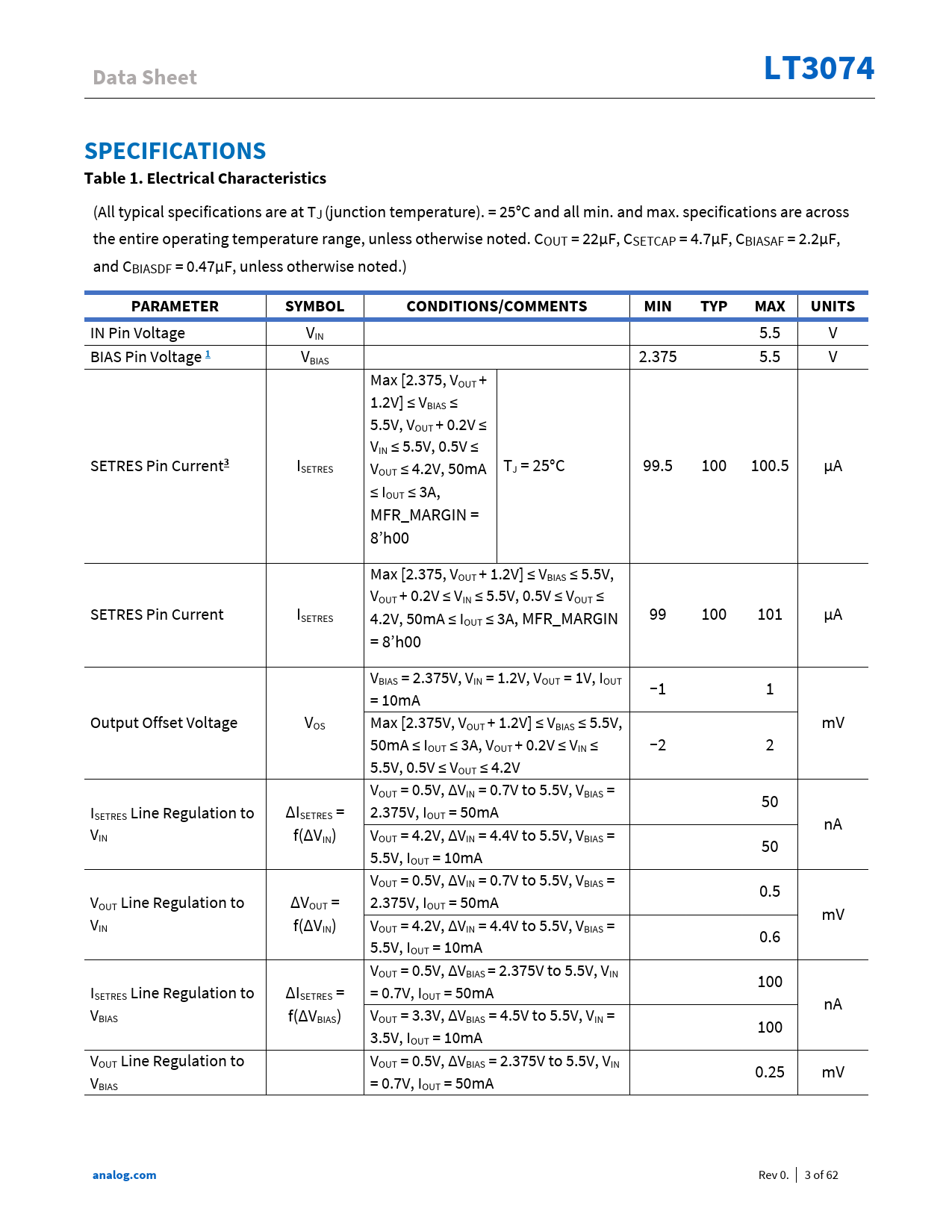 | Pages / Page | 62 / 3 — Data Sheet. LT3074. SPECIFICATIONS Table 1. Electrical Characteristics. … |