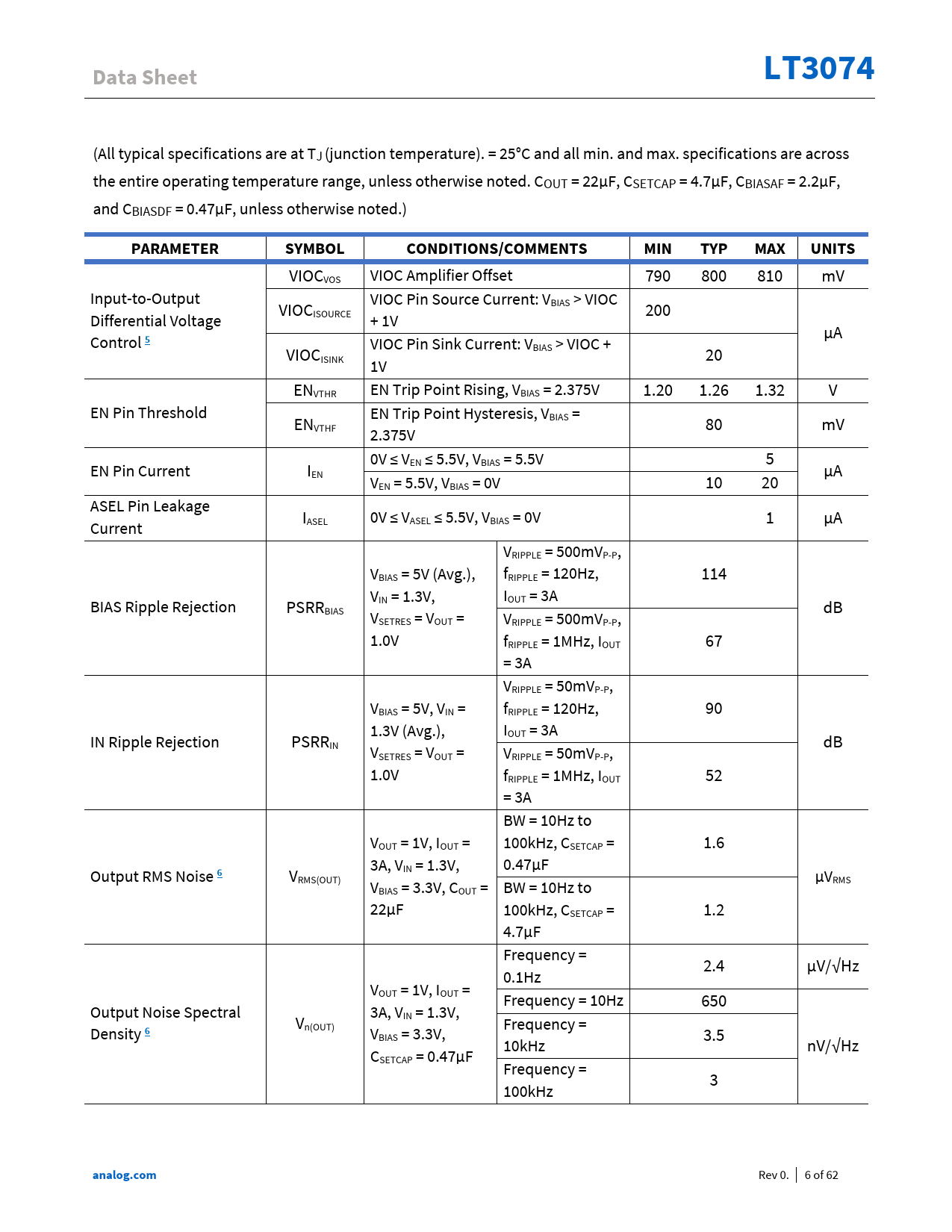 Pages / Page62 / 6 — Data Sheet. LT3074. PARAMETER. SYMBOL. CONDITIONS/COMMENTS. MIN. TYP. …