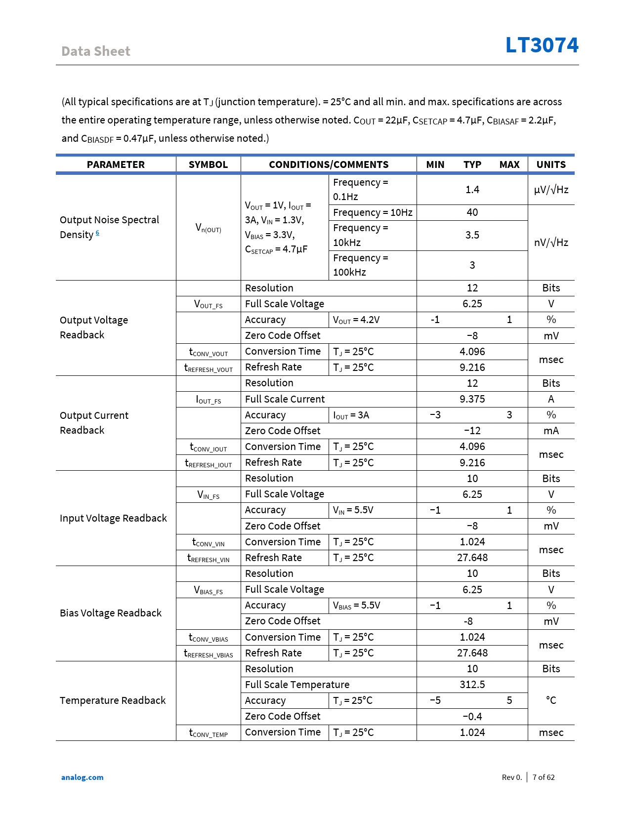 Pages / Page62 / 7 — Data Sheet. LT3074. PARAMETER. SYMBOL. CONDITIONS/COMMENTS. MIN. TYP. …