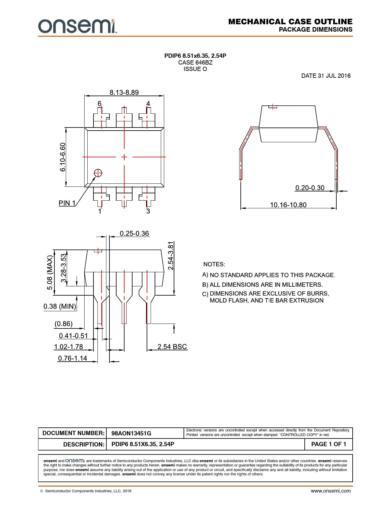 PACKAGE DIMENSIONS. PDIP6 8.51x6.35, 2.54P. DOCUMENT NUMBER: 98AON13451G. DESCRIPTION:. PDIP6 8.51X6.35, 2.54P. PAGE 1 OF 1. onsemi