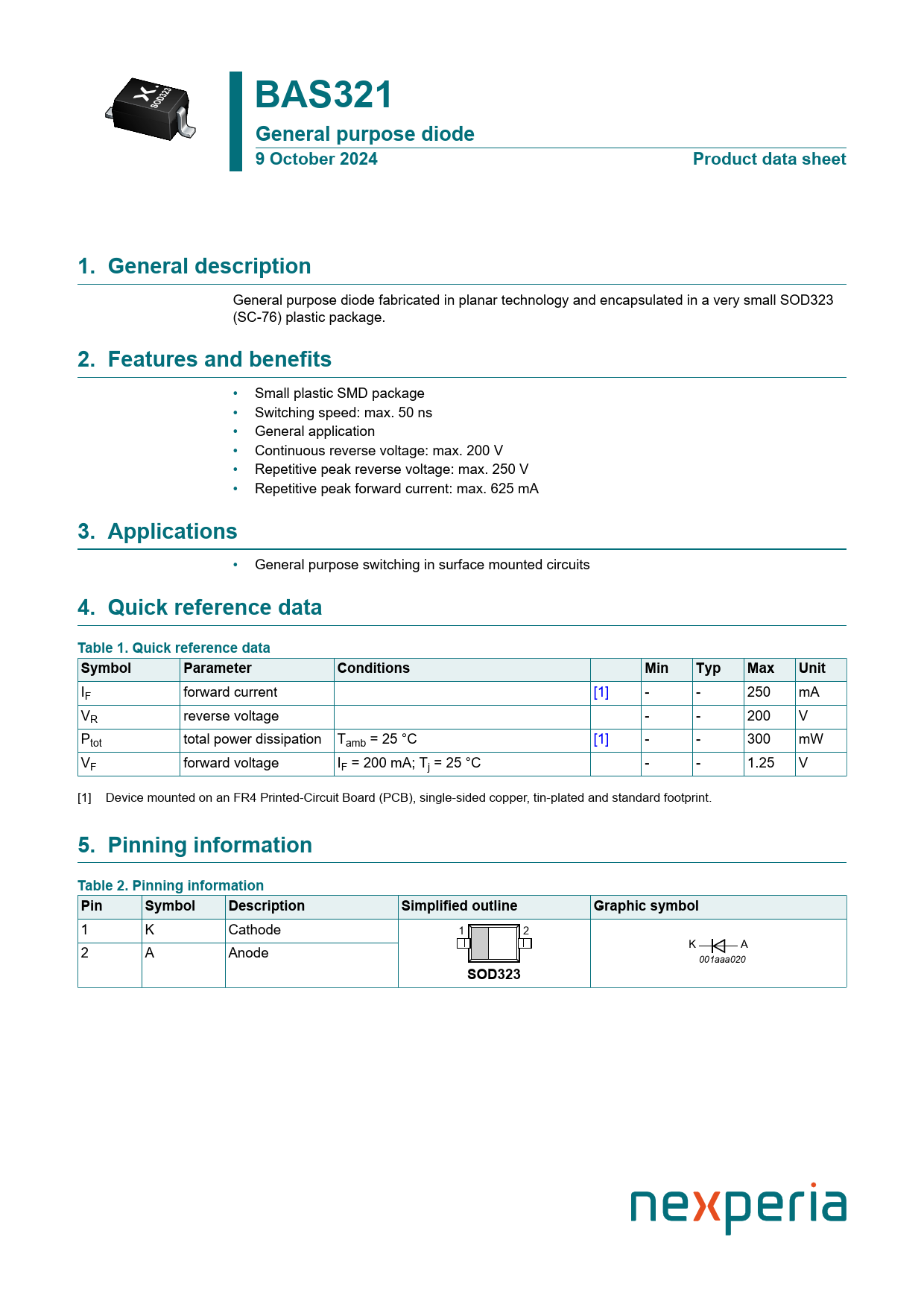 BAS321. General purpose diode. 9 October 2024. Product data sheet. 1. General description. 2. Features and benefits