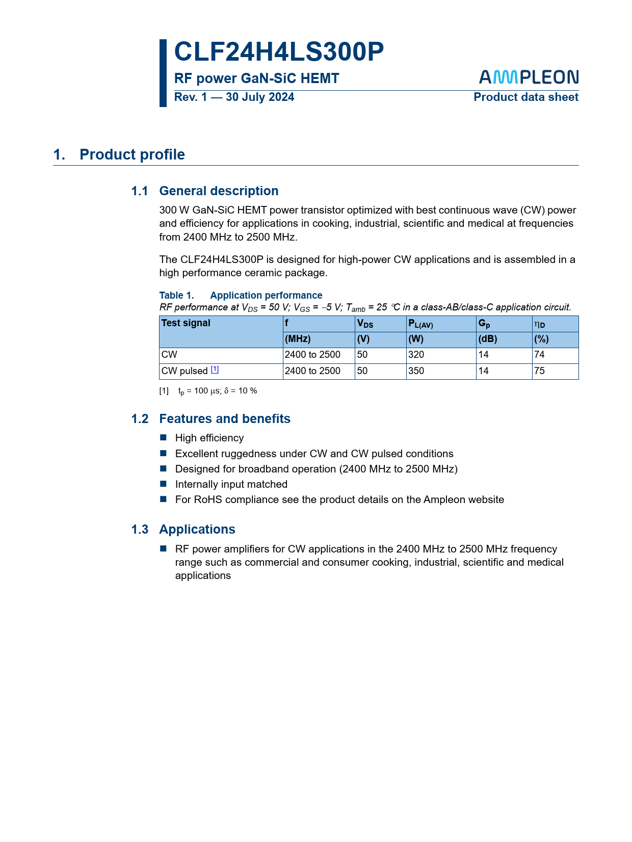 CLF24H4LS300P RF power GaN-SiC HEMT Rev. 1 — 30 July 2024. Product data sheet. 1. Product. profile. 1.1 General description