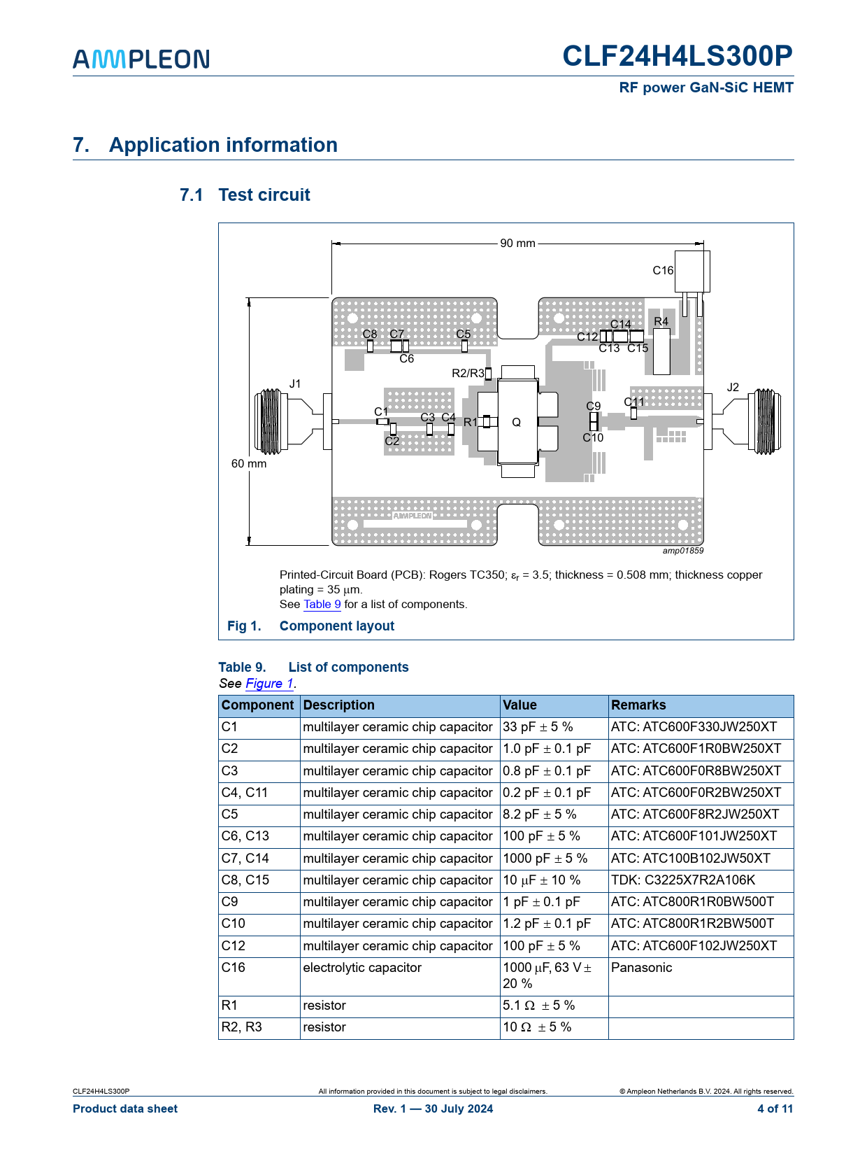 CLF24H4LS300P. RF power GaN-SiC HEMT. 7. Application. information. 7.1 Test circuit. Fig 1. Component layout. Table 9. List of co