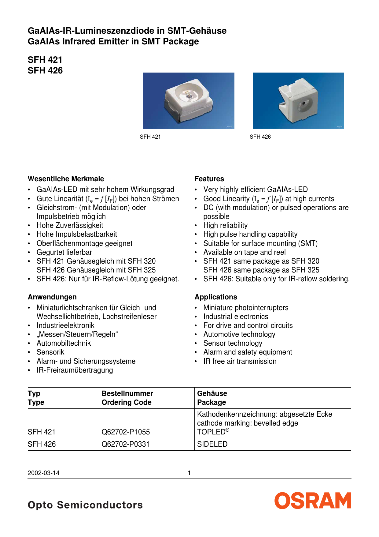 GaAlAs-IR-Lumineszenzdiode in SMT-Gehäuse GaAlAs Infrared Emitter in SMT PackageSFH 421 SFH 426 SFH 421 SFH 426 Wesentliche MerkmaleFeatures • GaAIAs-LED mit sehr hohem Wirkungsgrad • Very highly efficient GaAIAs-LED • Gute Linearität (I = f [I ]) bei hohen Strömen • Good Linearity ( = f [I ]) at high currents e F Ie F • Gleichstrom- (mit Modulation) oder • DC (with modulation) or pulsed operations are Impulsbetrieb möglich possible • Hohe Zuverlässigkeit • High reliability • Hohe Impulsbelastbarkeit • High pulse handling capability • Oberflächenmontage geeignet • Suitable for surface mounting (SMT) • Gegurtet lieferbar • Available on tape and reel • SFH 421 Gehäusegleich mit SFH 320 • SFH 421 same package as SFH 320 SFH 426 Gehäusegleich mit SFH 325 SFH 426 same package as SFH 325 • SFH 426: Nur für IR-Reflow-Lötung geeignet. • SFH 426: Suitable only for IR-reflow soldering. AnwendungenApplications • Miniaturlichtschranken für Gleich- und • Miniature photointerrupters Wechsellichtbetrieb, Lochstreifenleser • Industrial electronics • Industrieelektronik • For drive and control circuits • „Messen/Steuern/Regeln“ • Automotive technology • Automobiltechnik • Sensor technology • Sensorik • Alarm and safety equipment • Alarm- und Sicherungssysteme • IR free air transmission • IR-Freiraumübertragung TypBestellnummerGehäuseTypeOrdering CodePackage Kathodenkennzeichnung: abgesetzte Ecke cathode marking: bevelled edge SFH 421 Q62702-P1055 TOPLED® SFH 426 Q62702-P0331 SIDELED 2002-03-14 1