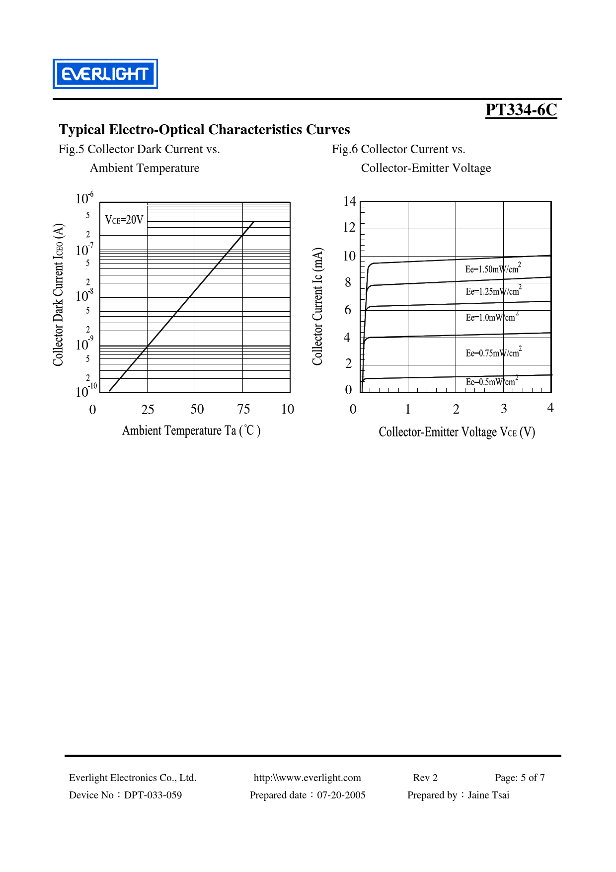 Fig.5 Collector Dark Current vs. Fig.6 Collector Current vs. Ambient Temperature Collector-Emitter Voltage 10 14 12 10 10 8 10 6 4 10 2 10 0 0 25 50 75 100 0 1 2 3 4 Everlight Electronics Co., Ltd. http:\\www.everlight.com Rev 2 Page: 5 of 7 Device No:DPT-033-059 Prepared date:07-20-2005 Prepared by:Jaine Tsai