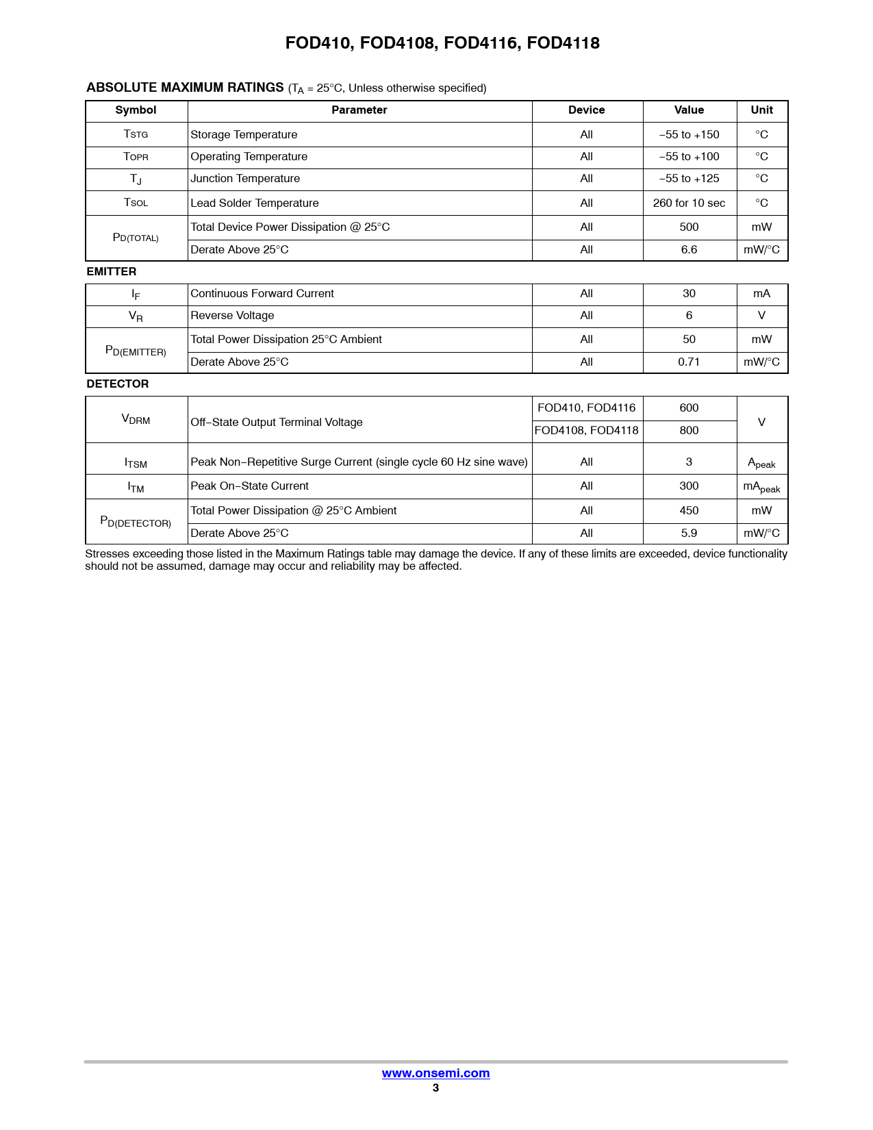FOD410, FOD4108, FOD4116, FOD4118ABSOLUTE MAXIMUM RATINGS (TA = 25°C, Unless otherwise specified) SymbolParameterDeviceValueUnit TSTG Storage Temperature All −55 to +150 °C TOPR Operating Temperature All −55 to +100 °C TJ Junction Temperature All −55 to +125 °C TSOL Lead Solder Temperature All 260 for 10 sec °C Total Device Power Dissipation @ 25°C All 500 mW PD(TOTAL) Derate Above 25°C All 6.6 mW/°C EMITTER IF Continuous Forward Current All 30 mA VR Reverse Voltage All 6 V Total Power Dissipation 25°C Ambient All 50 mW PD(EMITTER) Derate Above 25°C All 0.71 mW/°C DETECTOR FOD410, FOD4116 600 VDRM Off−State Output Terminal Voltage V FOD4108, FOD4118 800 ITSM Peak Non−Repetitive Surge Current (single cycle 60 Hz sine wave) All 3 Apeak ITM Peak On−State Current All 300 mApeak Total Power Dissipation @ 25°C Ambient All 450 mW PD(DETECTOR) Derate Above 25°C All 5.9 mW/°C Stresses exceeding those listed in the Maximum Ratings table may damage the device. If any of these limits are exceeded, device functionality should not be assumed, damage may occur and reliability may be affected. www.onsemi.com3