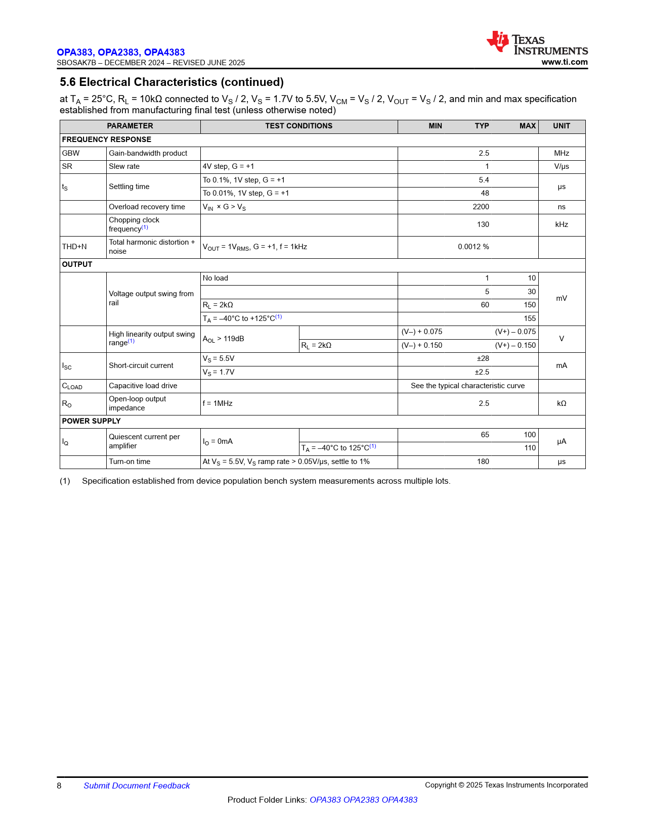 | Pages / Page | 36 / 8 — OPA383, OP. A2383, OP. A4383. www.ti.com. 5.6 Electrical Characteristics … |