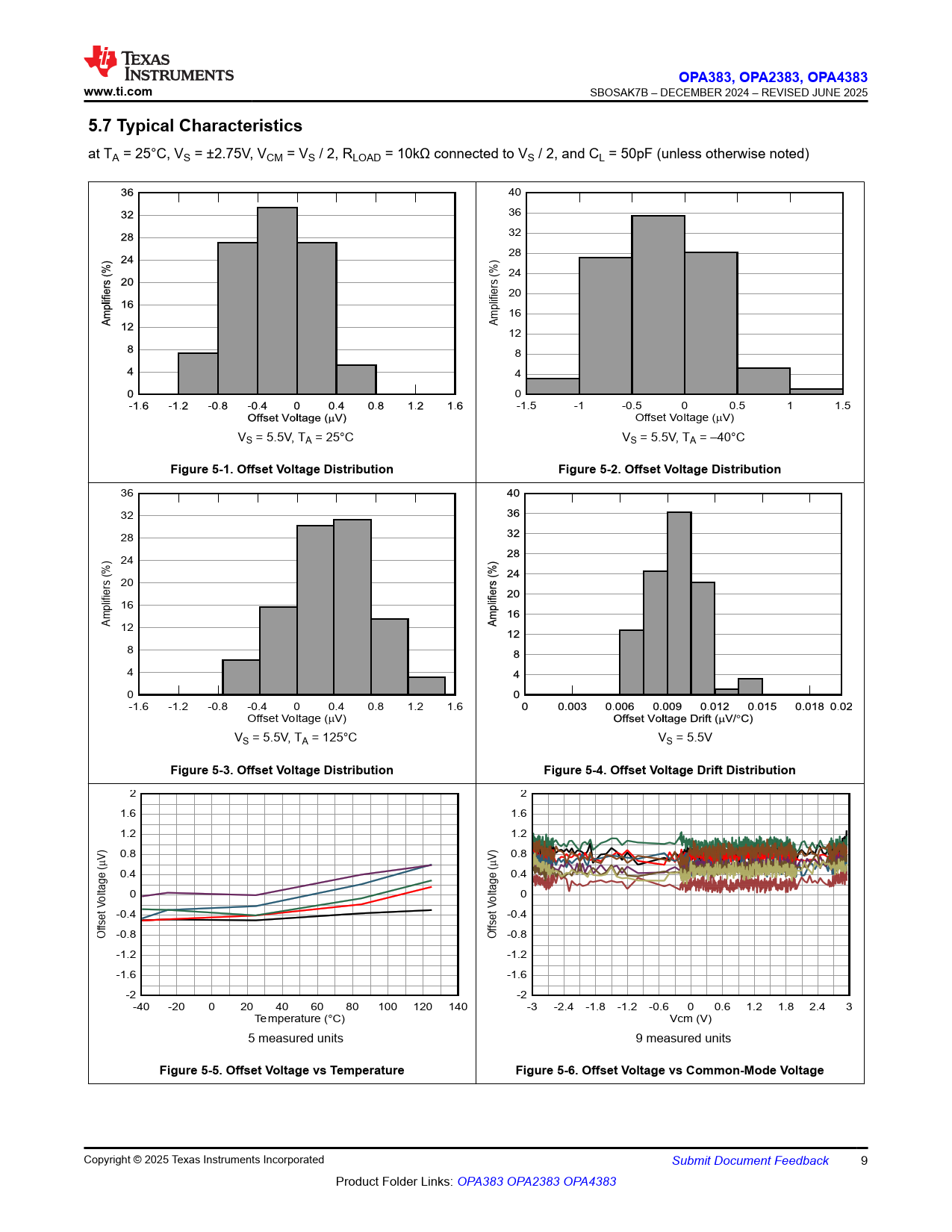 OPA383. , OPA2383. , OPA4383. www.ti.com. 5.7 Typical Characteristics. Figure 5-1. Offset Voltage Distribution