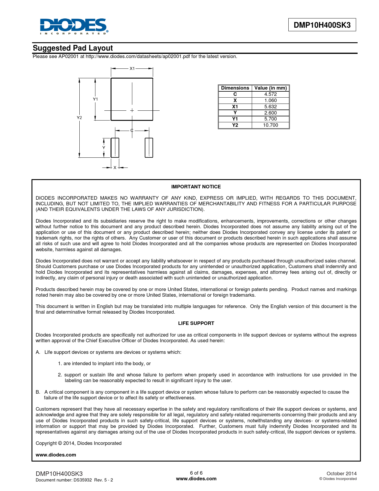 DMP10H400SK3. Suggested Pad Layout. Dimensions Value (in mm). IMPORTANT NOTICE. LIFE SUPPORT. www.diodes.com