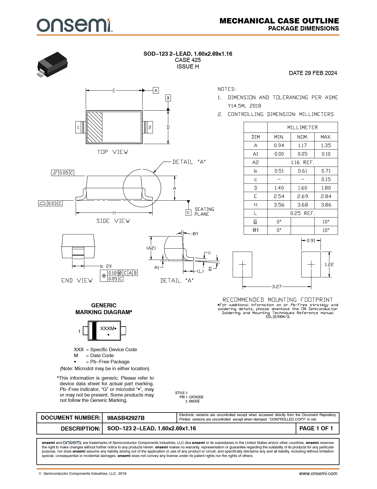 DESCRIPTION: SOD−123 2−LEAD, 1.60x2.69x1.16 PAGE 1 OF 1 onsemi