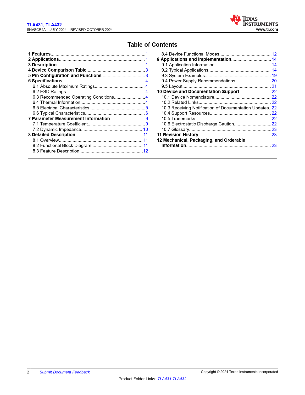 | Pages / Page | 31 / 2 — TLA431, TLA432. www.ti.com. Table of Contents. 1 Features. 2 … |