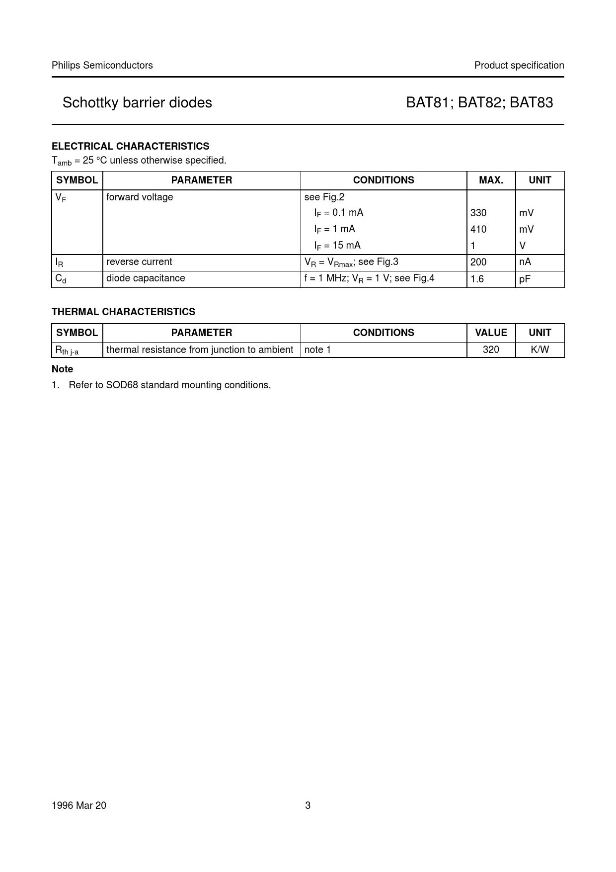 Philips Semiconductors Product specification Schottky barrier diodes BAT81; BAT82; BAT83 ELECTRICAL CHARACTERISTICS Tamb = 25 °C unless otherwise specified. SYMBOLPARAMETERCONDITIONSMAX.UNIT VF forward voltage see Fig.2 IF = 0.1 mA 330 mV IF = 1 mA 410 mV IF = 15 mA 1 V IR reverse current VR = VRmax; see Fig.3 200 nA Cd diode capacitance f = 1 MHz; VR = 1 V; see Fig.4 1.6 pF THERMAL CHARACTERISTICSSYMBOLPARAMETERCONDITIONSVALUEUNIT Rth j-a thermal resistance from junction to ambient note 1 320 K/W Note 1. Refer to SOD68 standard mounting conditions. 1996 Mar 20 3