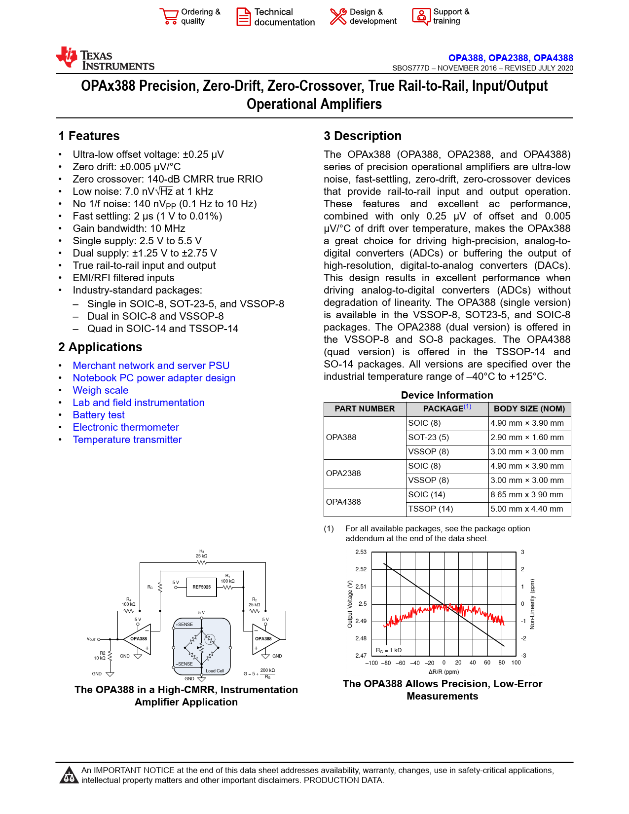 link to page 1 OPA388, OPA2388, OPA4388 SBOS777D – NOVEMBER 2016 – REVISED JULY 2020 OPAx388 Precision, Zero-Drift, Zero-Crossover, True Rail-to-Rail, Input/OutputOperational Amplifiers1 Features3 Description • Ultra-low offset voltage: ±0.25 µV The OPAx388 (OPA388, OPA2388, and OPA4388) • Zero drift: ±0.005 µV/°C series of precision operational amplifiers are ultra-low • Zero crossover: 140-dB CMRR true RRIO noise, fast-settling, zero-drift, zero-crossover devices • Low noise: 7.0 nV√Hz at 1 kHz that provide rail-to-rail input and output operation. • No 1/f noise: 140 nVPP (0.1 Hz to 10 Hz) These features and excellent ac performance, • Fast settling: 2 µs (1 V to 0.01%) combined with only 0.25 µV of offset and 0.005 • Gain bandwidth: 10 MHz µV/°C of drift over temperature, makes the OPAx388 • Single supply: 2.5 V to 5.5 V a great choice for driving high-precision, analog-to- • Dual supply: ±1.25 V to ±2.75 V digital converters (ADCs) or buffering the output of • True rail-to-rail input and output high-resolution, digital-to-analog converters (DACs). • EMI/RFI filtered inputs This design results in excellent performance when • Industry-standard packages: driving analog-to-digital converters (ADCs) without – Single in SOIC-8, SOT-23-5, and VSSOP-8 degradation of linearity. The OPA388 (single version) – Dual in SOIC-8 and VSSOP-8 is available in the VSSOP-8, SOT23-5, and SOIC-8 – Quad in SOIC-14 and TSSOP-14 packages. The OPA2388 (dual version) is offered in the VSSOP-8 and SO-8 packages. The OPA4388 2 Applications (quad version) is offered in the TSSOP-14 and • Merchant network and server PSU SO-14 packages. All versions are specified over the • Notebook PC power adapter design industrial temperature range of –40°C to +125°C. • Weigh scale Device Information • Lab and field instrumentation PART NUMBERPACKAGE (1) BODY SIZE (NOM) • Battery test • Electronic thermometer SOIC (8) 4.90 mm × 3.90 mm • Temperature transmitter OPA388 SOT-23 (5) 2.90 mm × 1.60 mm VSSOP (8) 3.00 mm × 3.00 mm SOIC (8) 4.90 mm × 3.90 mm OPA2388 VSSOP (8) 3.00 mm × 3.00 mm SOIC (14) 8.65 mm x 3.90 mm OPA4388 TSSOP (14) 5.00 mm x 4.40 mm (1) For all available packages, see the package option addendum at the end of the data sheet. R3 2.53 3 25 k 2.52 2 R4 ) 100 k ) 5 V m R REF5025 (V 2.51 1 p G e g y (p R R 4 2 lta rit 100 k 25 k o 2.5 0 a V t 5 V ine u -L 5 V 5 V tp 2.49 -1 +SENSE Ou Non ± ± V OPA388OPA388 OUT 2.48 -2 + + R = 1 kŸ R2 G GND GND 2.47 -3 10 k ±SENSE ±100 ±80 ±60 ±40 ±20 0 20 40 60 80 100 200 Load Cell NŸ GND G = 5 + û5 5 SSP C001 R GND G The OPA388 in a High-CMRR, InstrumentationThe OPA388 Allows Precision, Low-ErrorAmplifier ApplicationMeasurements An IMPORTANT NOTICE at the end of this data sheet addresses availability, warranty, changes, use in safety-critical applications, intellectual property matters and other important disclaimers. PRODUCTION DATA. Document Outline 1 Features 2 Applications 3 Description Table of Contents 4 Revision History 5 Pin Configuration and Functions 6 Specifications 6.1 Absolute Maximum Ratings 6.2 ESD Ratings 6.3 Recommended Operating Conditions 6.4 Thermal Information: OPA388 6.5 Thermal Information: OPA2388 6.6 Thermal Information: OPA4388 6.7 Electrical Characteristics: VS = ±1.25 V to ±2.75 V (VS = 2.5 to 5.5 V) 6.8 Typical Characteristics 7 Detailed Description 7.1 Overview 7.2 Functional Block Diagram 7.3 Feature Description 7.3.1 Operating Voltage 7.3.2 Input Voltage and Zero-Crossover Functionality 7.3.3 Input Differential Voltage 7.3.4 Internal Offset Correction 7.3.5 EMI Susceptibility and Input Filtering 7.4 Device Functional Modes 8 Application and Implementation 8.1 Application Information 8.2 Typical Applications 8.2.1 Bidirectional Current-Sensing 8.2.1.1 Design Requirements 8.2.1.2 Detailed Design Procedure 8.2.1.3 Application Curve 8.2.2 Single Operational Amplifier Bridge Amplifier 8.2.3 Precision, Low-Noise, DAC Buffer 8.2.4 Load Cell Measurement 9 Power Supply Recommendations 10 Layout 10.1 Layout Guidelines 10.2 Layout Example 11 Device and Documentation Support 11.1 Device Support 11.1.1 Development Support 11.1.1.1 TINA-TI™ Simulation Software (Free Download) 11.1.1.2 TI Precision Designs 11.2 Documentation Support 11.2.1 Related Documentation 11.3 Related Links 11.4 Receiving Notification of Documentation Updates 11.5 Support Resources 11.6 Trademarks 11.7 Electrostatic Discharge Caution 11.8 Glossary 12 Mechanical, Packaging, and Orderable Information