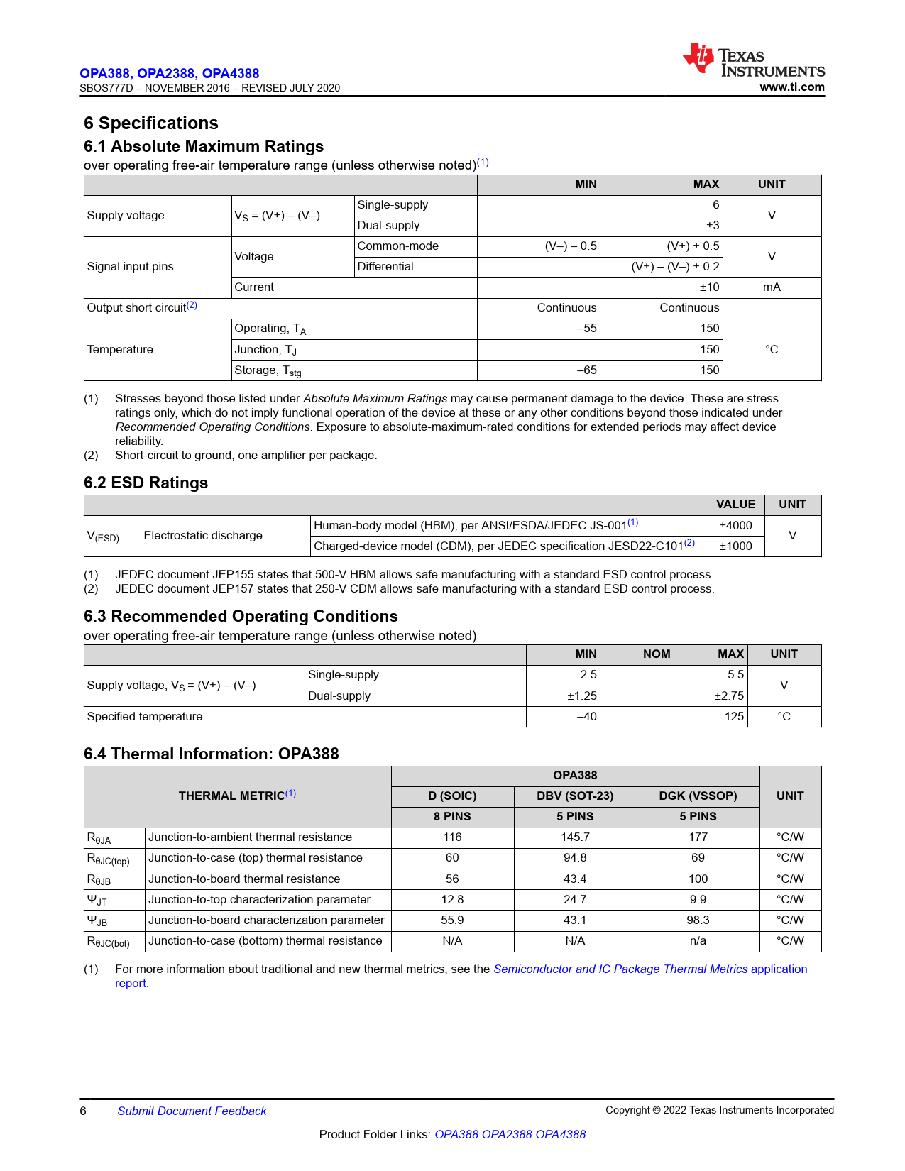 OPA388, OP. A2388, OP. A4388. www.ti.com. 6 Specifications 6.1 Absolute Maximum Ratings. MIN. MAX. UNIT. 6.2 ESD Ratings. VALUE