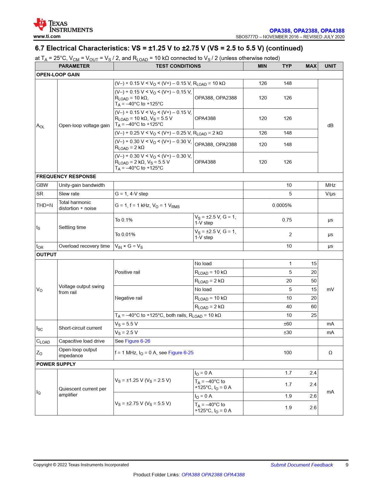 (V–) + 0.15 V < VO < (V+) – 0.15 V, RLOAD = 10 kΩ 126 148 (V–) + 0.15 V < VO < (V+) – 0.15 V, RLOAD = 10 kΩ, OPA388, OPA2388 120 126 TA = –40°C to +125°C (V–) + 0.15 V < VO < (V+) – 0.15 V, RLOAD = 10 kΩ, VS = 5.5 V OPA4388 120 126 A T OL Open-loop voltage gain A = –40°C to +125°C dB (V–) + 0.25 V < VO < (V+) – 0.25 V, RLOAD = 2 kΩ 126 148 (V–) + 0.30 V < VO < (V+) – 0.30 V, OPA388, OPA2388 120 148 RLOAD = 2 kΩ (V–) + 0.30 V < VO < (V+) – 0.30 V, RLOAD = 2 kΩ, VS = 5.5 V OPA4388 120 126 TA = –40°C to +125°C
