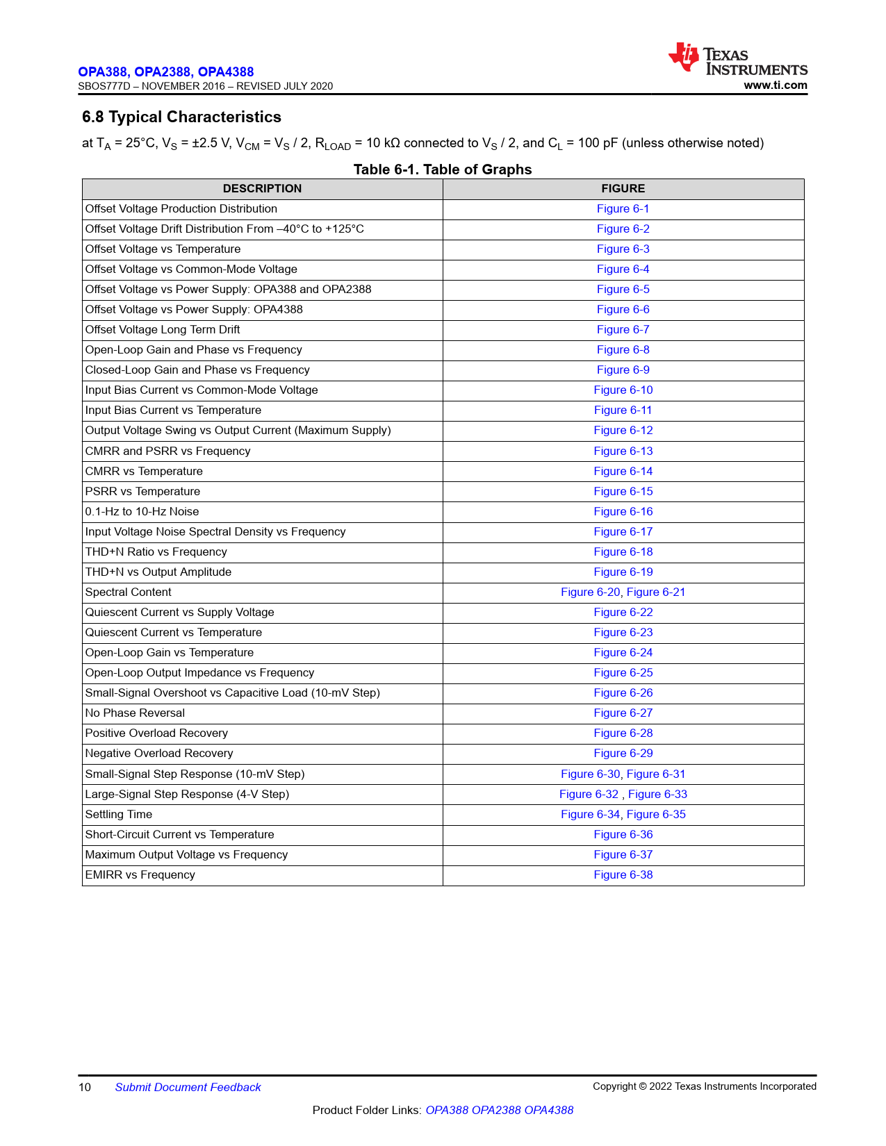 OPA388, OP. A2388, OP. A4388. www.ti.com. 6.8 Typical Characteristics. Table 6-1. Table of Graphs. DESCRIPTION. FIGURE