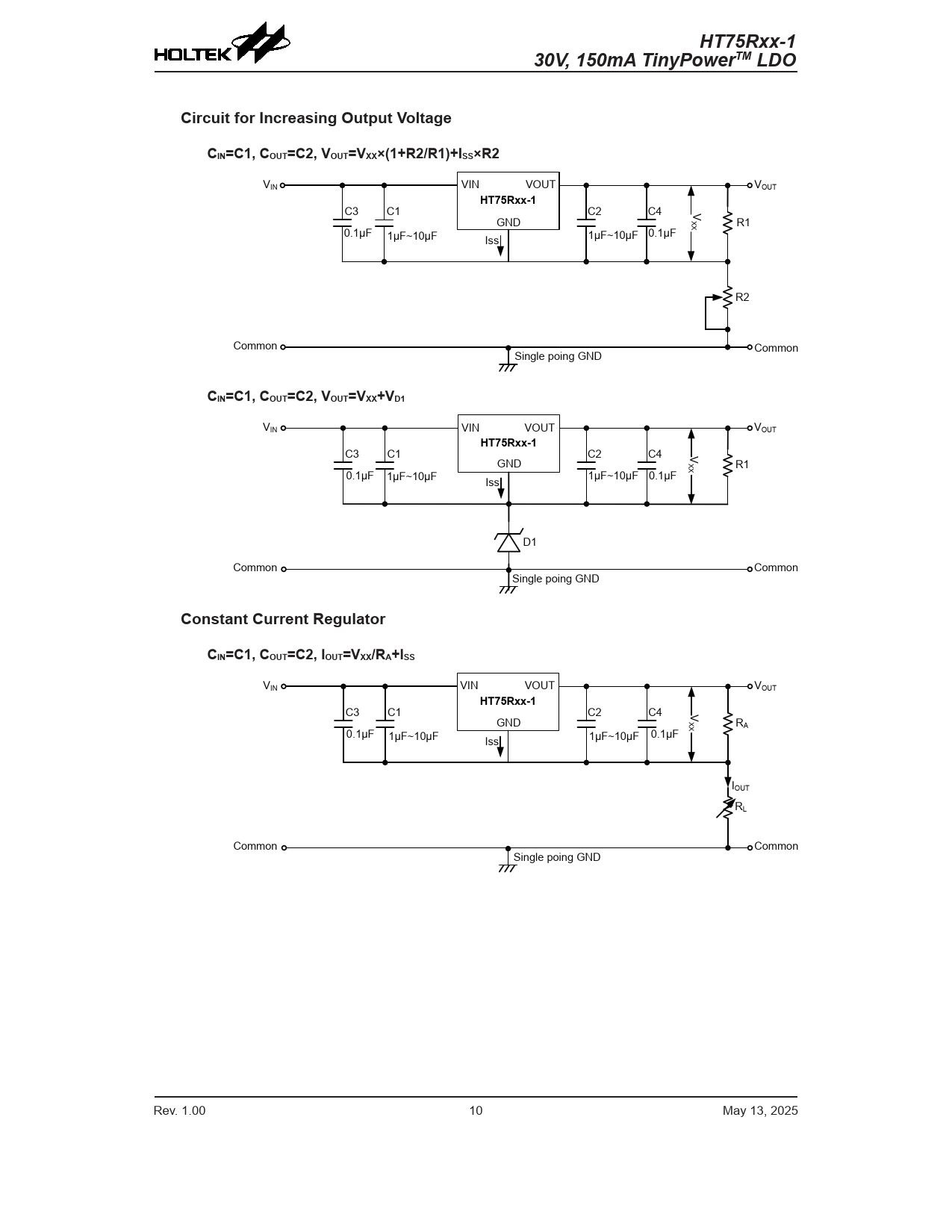 HT75Rxx-130V, 150mA TinyPowerTM LDOCircuit for Increasing Output VoltageCIN=C1, COUT=C2, VOUT=VXX×(1+R2/R1)+ISS×R2 VIN VIN VOUT VOUT HT75Rxx-1 C3 C1 C2 C4 V GND XX R1 0.1µF 1µF~10µF 1µF~10µF 0.1µF Iss R2 Common Common Single poing GND CIN=C1, COUT=C2, VOUT=VXX+VD1 VIN VIN VOUT VOUT HT75Rxx-1 C3 C1 C2 C4 V GND XX R1 0.1µF 1µF~10µF 1µF~10µF 0.1µF Iss D1 Common Common Single poing GND Constant Current RegulatorCIN=C1, COUT=C2, IOUT=VXX/RA+ISS VIN VIN VOUT VOUT HT75Rxx-1 C3 C1 C2 C4 V GND XX RA 0.1µF 1µF~10µF 1µF~10µF 0.1µF Iss IOUT RL Common Common Single poing GND Rev. 1.00 10 May 13, 2025 Document Outline Features Applications General Description Selection Table Block Diagram Pin Assignment Pin Description Absolute Maximum Ratings Recommended Operating Range Electrical Characteristics Typical Performance Characteristic Application Circuits Basic Circuit High Output Current Positive Voltage Regulator Short-Circuit Protection by Tr1 Circuit for Increasing Output Voltage Constant Current Regulator Dual Supply Circuit Application Information External Circuit Input Capacitor CIN Considerations Output Capacitor COUT Considerations Thermal Considerations Power Dissipation Calculation Package Information 3-pin SOT89 Outline Dimensions 5-pin SOT23 Outline Dimensions