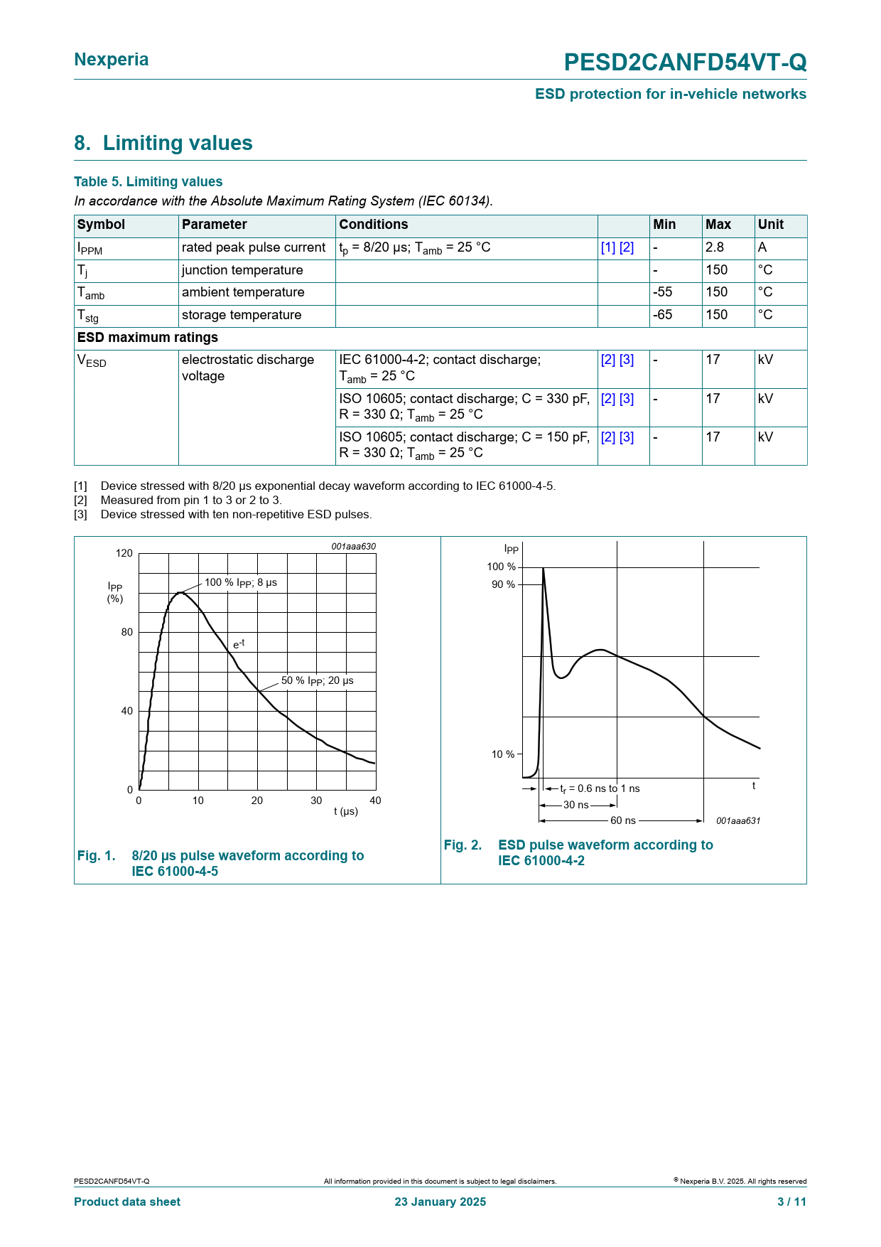 Nexperia. PESD2CANFD54VT-Q. ESD protection for in-vehicle networks. 8. Limiting values Table 5. Limiting values. Symbol