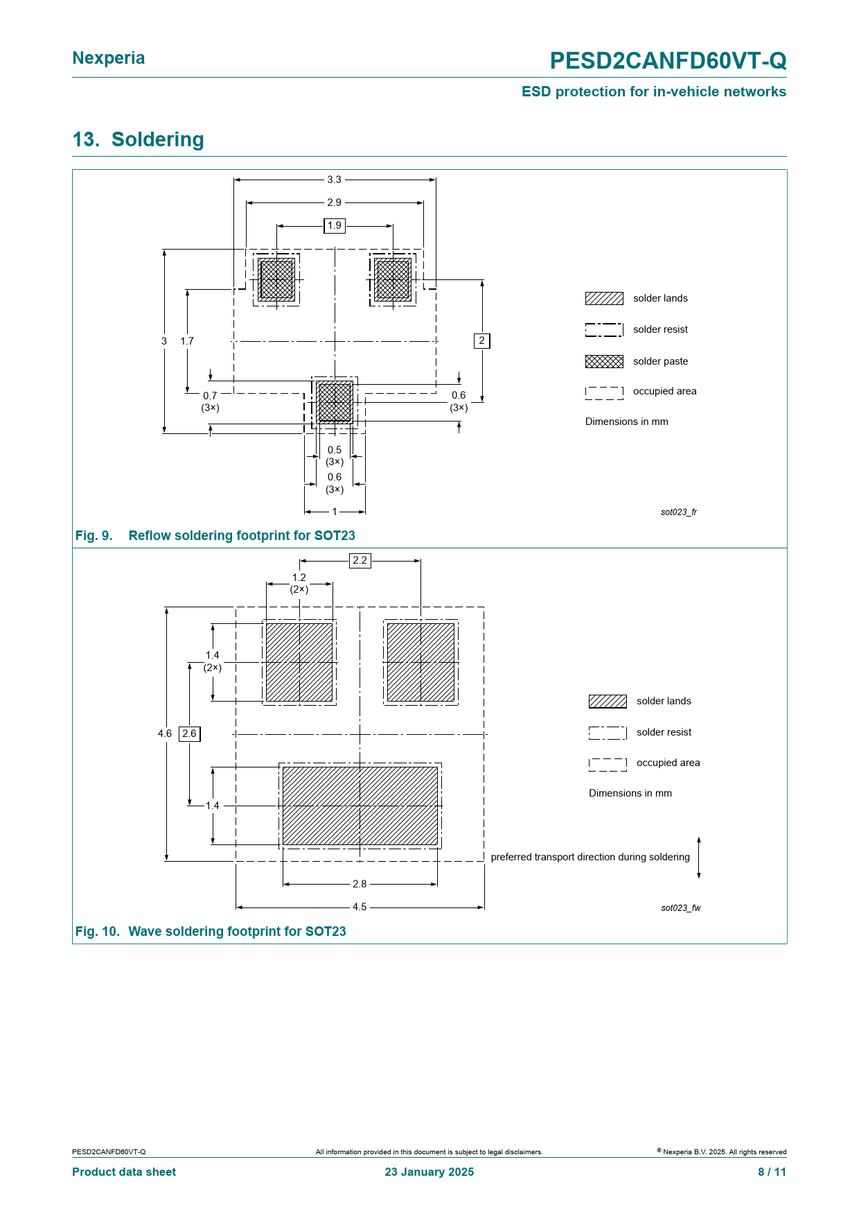 Nexperia. PESD2CANFD60VT-Q. ESD protection for in-vehicle networks. 13. Soldering. Fig. 9. Reflow soldering footprint for SOT23