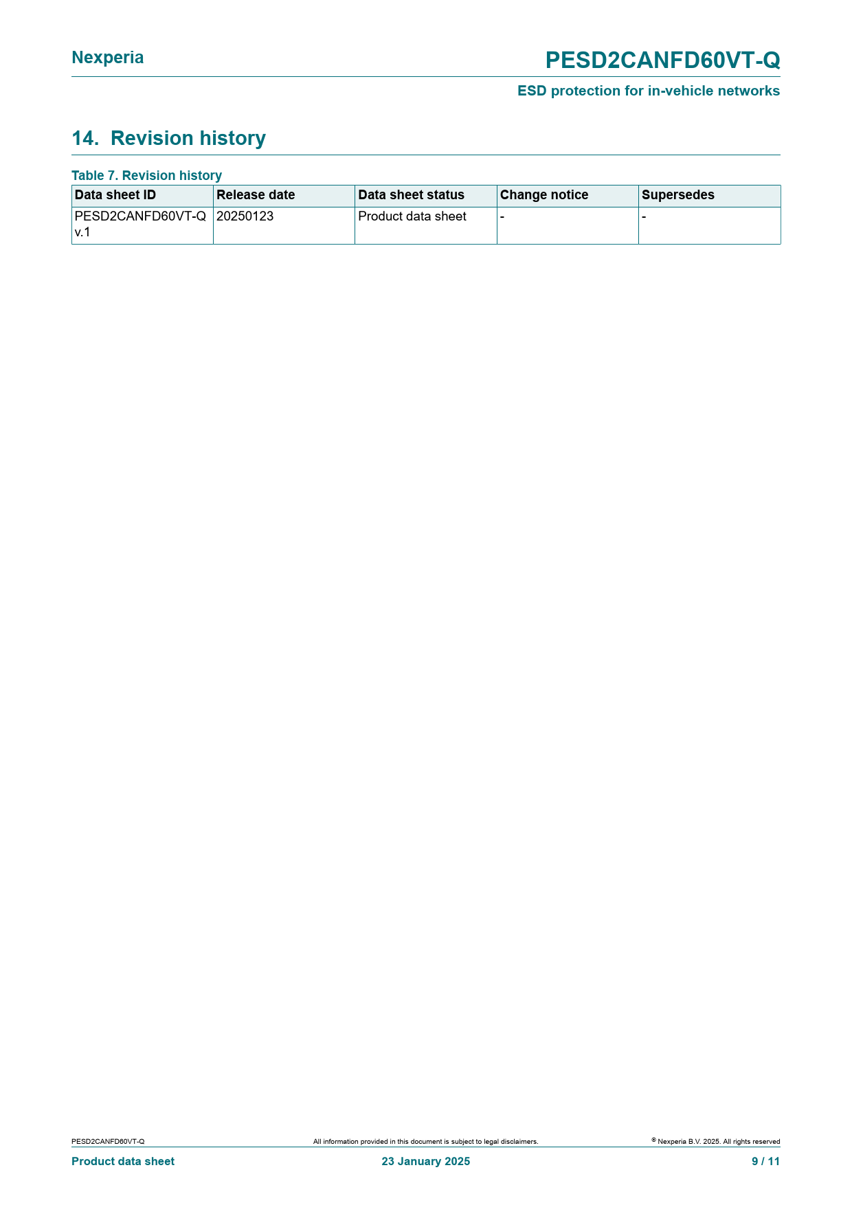 Nexperia. PESD2CANFD60VT-Q. ESD protection for in-vehicle networks. 14. Revision history Table 7. Revision history