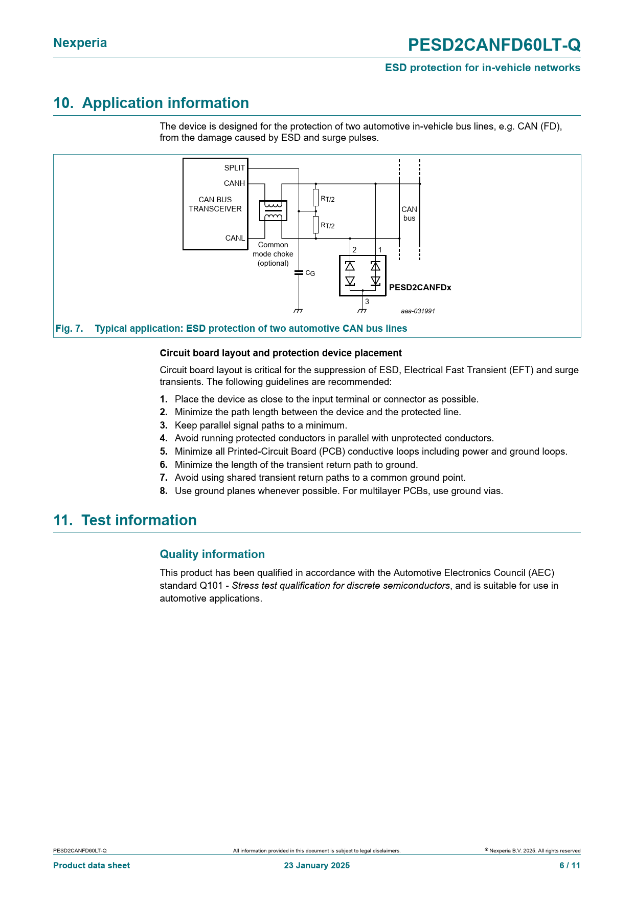 This product has been qualified in accordance with the Automotive Electronics Council (AEC) standard Q101 - Stress test qualification for discrete semiconductors, and is suitable for use in automotive applications. PESD2CANFD60LT-Q All information provided in this document is subject to legal disclaimers. © Nexperia B.V. 2025. Al rights reserved