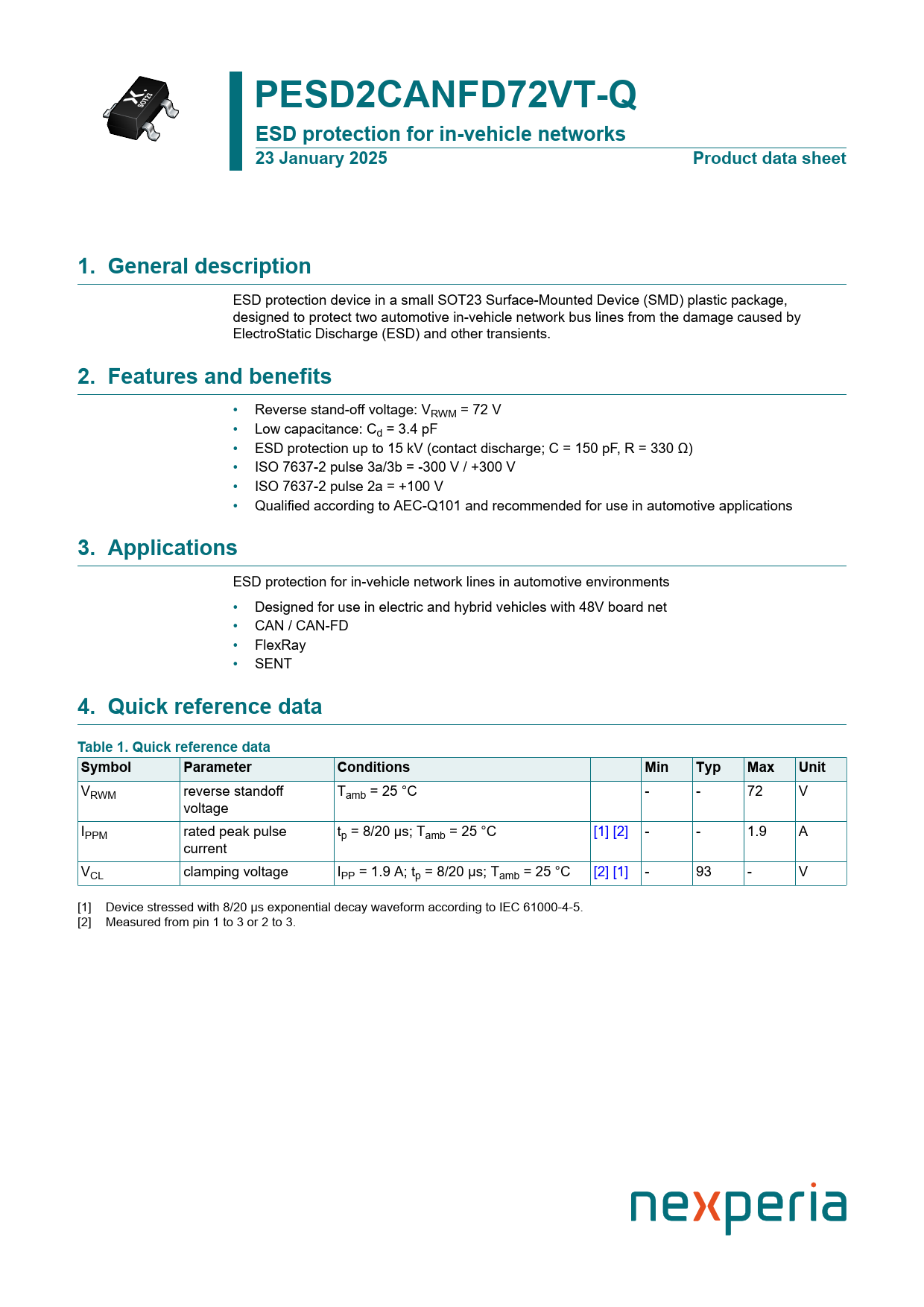 link to page 1 link to page 1 link to page 1 link to page 1 PESD2CANFD72VT-QESD protection for in-vehicle networks23 January 2025Product data sheet1. General description ESD protection device in a small SOT23 Surface-Mounted Device (SMD) plastic package, designed to protect two automotive in-vehicle network bus lines from the damage caused by ElectroStatic Discharge (ESD) and other transients. 2. Features and benefits • Reverse stand-of voltage: VRWM = 72 V • Low capacitance: Cd = 3.4 pF • ESD protection up to 15 kV (contact discharge; C = 150 pF, R = 330 Ω) • ISO 7637-2 pulse 3a/3b = -300 V / +300 V • ISO 7637-2 pulse 2a = +100 V • Qualified according to AEC-Q101 and recommended for use in automotive applications 3. Applications ESD protection for in-vehicle network lines in automotive environments • Designed for use in electric and hybrid vehicles with 48V board net • CAN / CAN-FD • FlexRay • SENT 4. Quick reference data Table 1. Quick reference dataSymbolParameterConditionsMinTypMaxUnit VRWM reverse standof Tamb = 25 °C - - 72 V voltage IPPM rated peak pulse tp = 8/20 µs; Tamb = 25 °C [1] [2] - - 1.9 A current VCL clamping voltage IPP = 1.9 A; tp = 8/20 µs; Tamb = 25 °C [2] [1] - 93 - V [1] Device stressed with 8/20 μs exponential decay waveform according to IEC 61000-4-5. [2] Measured from pin 1 to 3 or 2 to 3. Document Outline 1. General description 2. Features and benefits 3. Applications 4. Quick reference data 5. Pinning information 6. Ordering information 7. Marking 8. Limiting values 9. Characteristics 10. Application information 11. Test information 12. Package outline 13. Soldering 14. Revision history 15. Legal information Contents