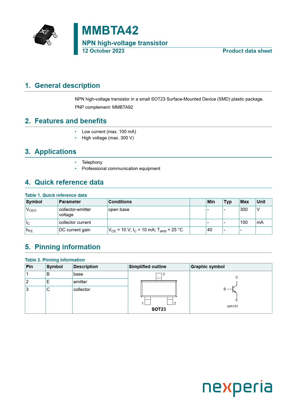 MMBTA42. NPN high-voltage transistor. 12 October 2023. Product data sheet. 1. General description. 2. Features and benefits