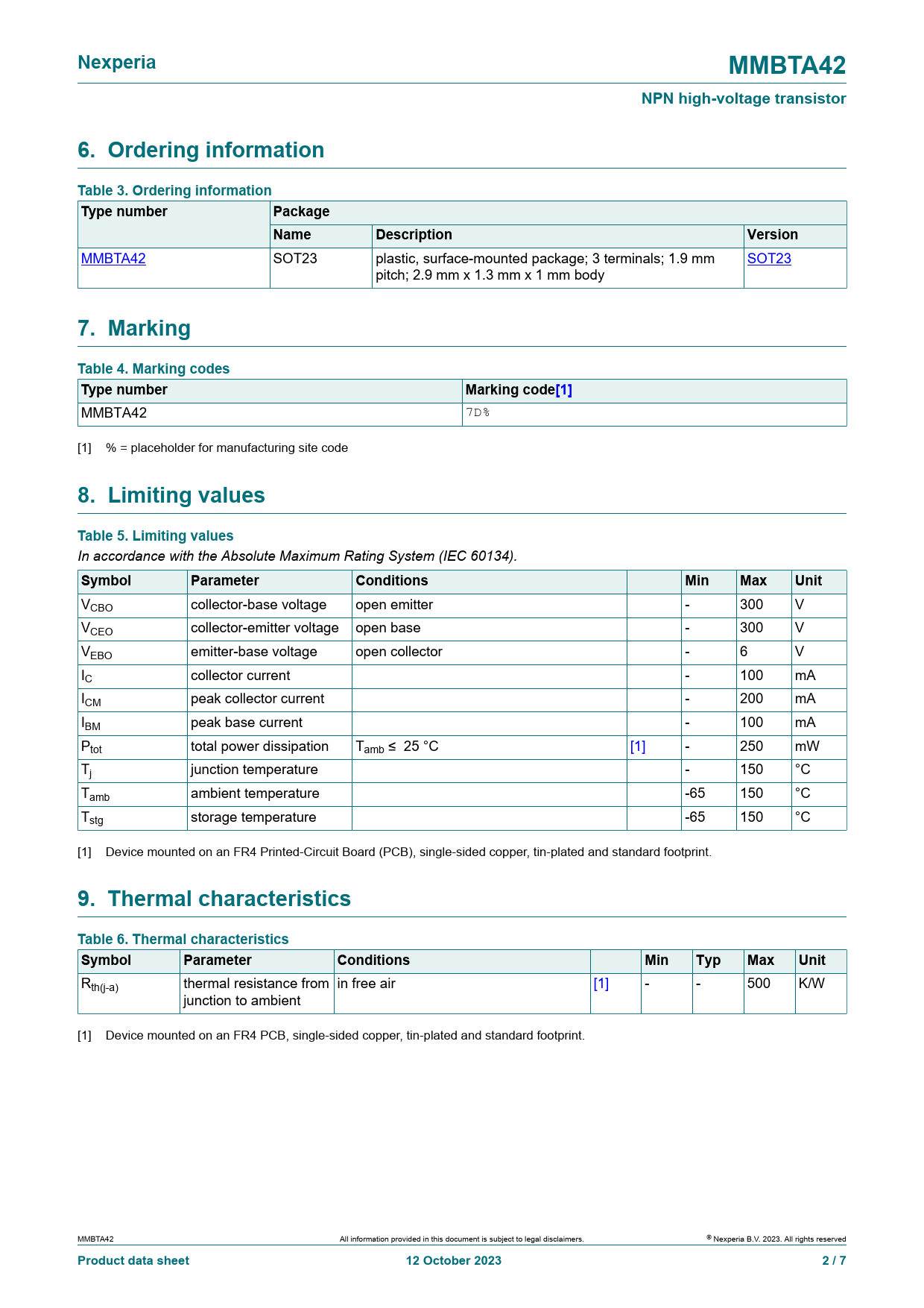 | Pages / Page | 7 / 2 — Nexperia. MMBTA42. NPN high-voltage transistor. 6. Ordering information … |