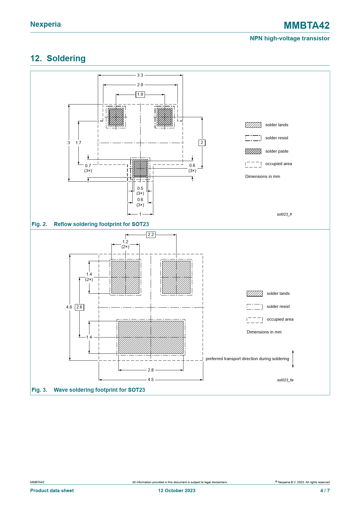 Nexperia. MMBTA42. NPN high-voltage transistor. 12. Soldering. Fig. 2. Reflow soldering footprint for SOT23